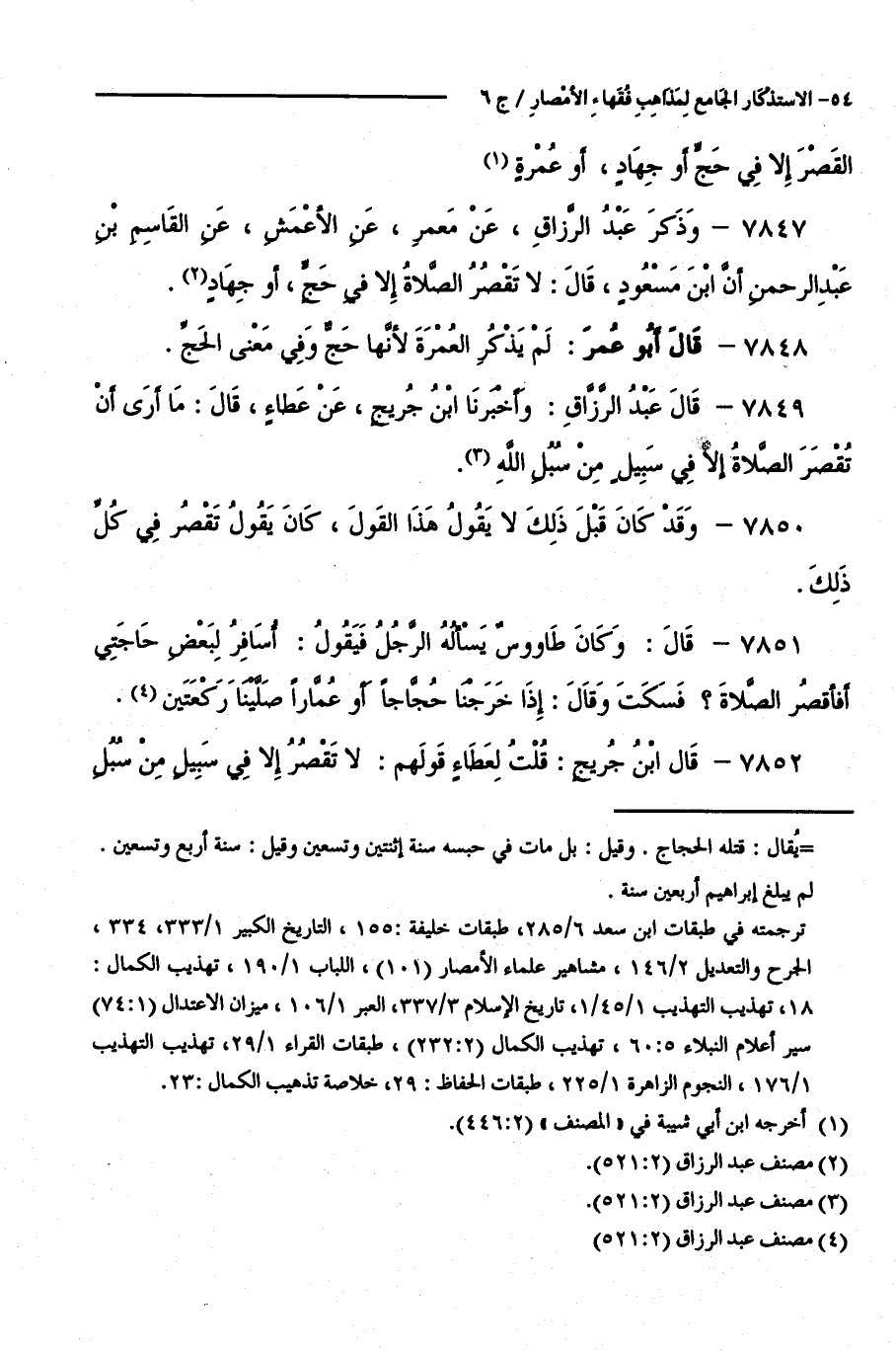 7847 - وَذَكَرَ عَبْدُ الرَّزَّاقِ، عَنْ مَعْمَرٍ، عَنِ الْأَعْمَشِ، عَنِ الْقَاسِمِ بْنِ عَبْدِ الرَّحْمَنِ أَنَّ ابْنَ مَسْعُودٍ، قَالَ: لَا تُقْصَرُ الصَّلَاةُ إِلَّا فِي حَجٍّ، أَوْ جِهَادٍ.