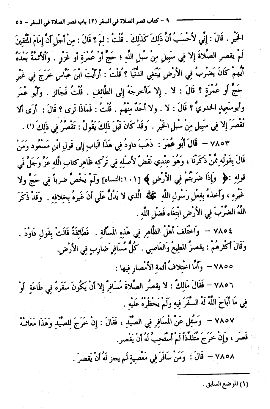 7854 - وَاخْتَلَفَ أَهْلُ الظَّاهِرِ فِي هَذِهِ الْمَسْأَلَةِ. فَطَائِفَةٌ قَالَتْ بِقَوْلِ دَاوُدَ. وَقَالَ أَكْثَرُهُمْ: يَقْصُرُ الْمُطِيعُ وَالْعَاصِي. كُلُّ مُسَافِرٍ ضَارِبٍ فِي الْأَرْضِ.