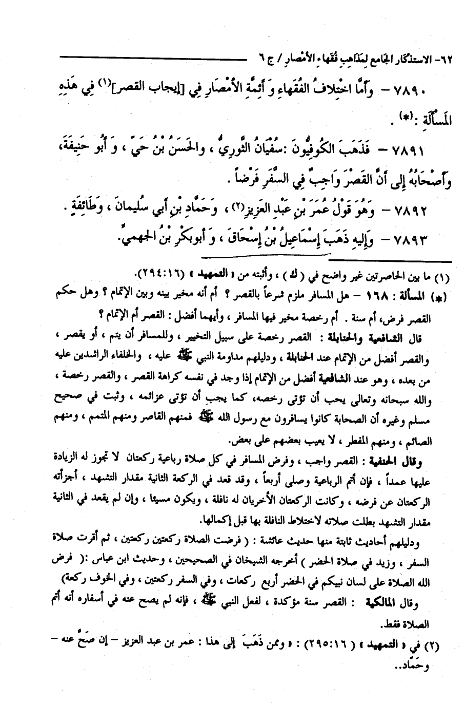 7891 - فَذَهَبَ الْكُوفِيُّونَ: سُفْيَانُ الثَّوْرِيُّ، وَالْحَسَنُ بْنُ حَيٍّ، وَأَبُو حَنِيفَةَ وَأَصْحَابُهُ، إِلَى أَنَّ الْقَصْرَ وَاجِبٌ فِي السَّفَرِ فَرْضًا.