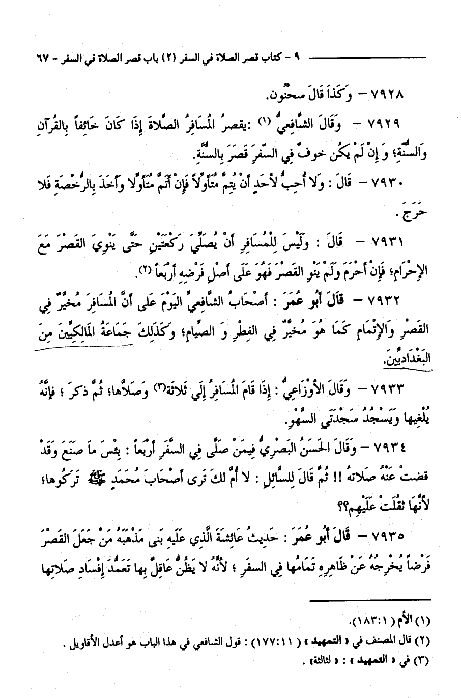 7932 - قَالَ أَبُو عُمَرَ: أَصْحَابُ الشَّافِعِيِّ الْيَوْمَ عَلَى أَنَّ الْمُسَافِرَ مُخَيَّرٌ فِي الْقَصْرِ وَالْإِتْمَامِ كَمَا هُوَ مُخَيَّرٌ فِي الْفِطْرِ وَالصِّيَامِ، وَكَذَلِكَ جَمَاعَةُ الْمَالِكِيِّينَ مِنَ الْبَغْدَادِيِّينَ.