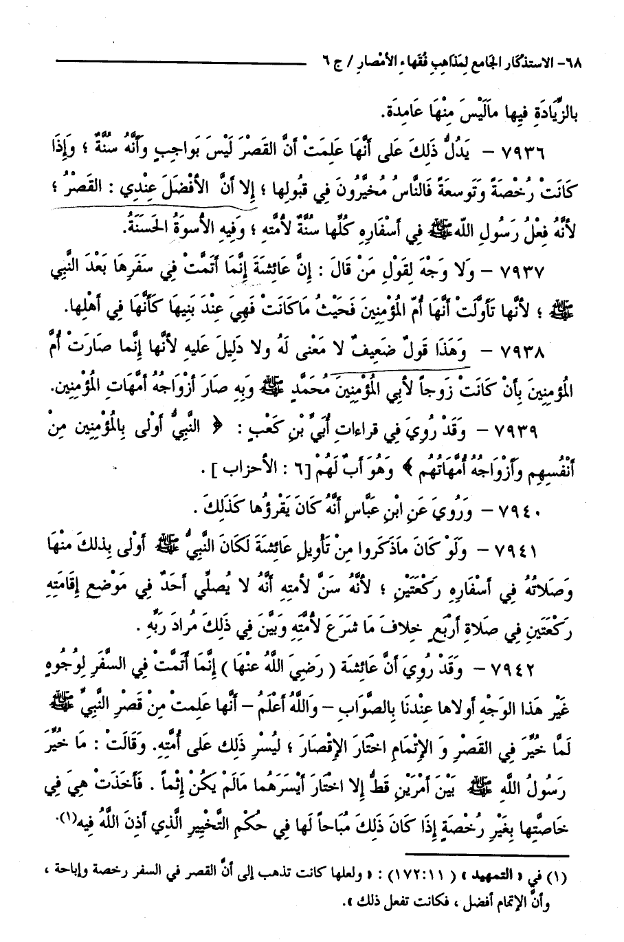 7937 - وَلَا وَجْهَ لِقَوْلِ مَنْ قَالَ: إِنَّ عَائِشَةَ إِنَّمَا أَتَمَّتْ فِي سَفَرِهَا بَعْدَ النَّبِيِّ - صَلَّى اللَّهُ عَلَيْهِ وَسَلَّمَ - ; لِأَنَّهَا تَأَوَّلَتْ أَنَّهَا أُمُّ الْمُؤْمِنِينَ فَحَيْثُ مَا كَانَتْ فَهِيَ عِنْدَ بَنِيهَا كَأَنَّهَا فِي أَهْلِهَا.