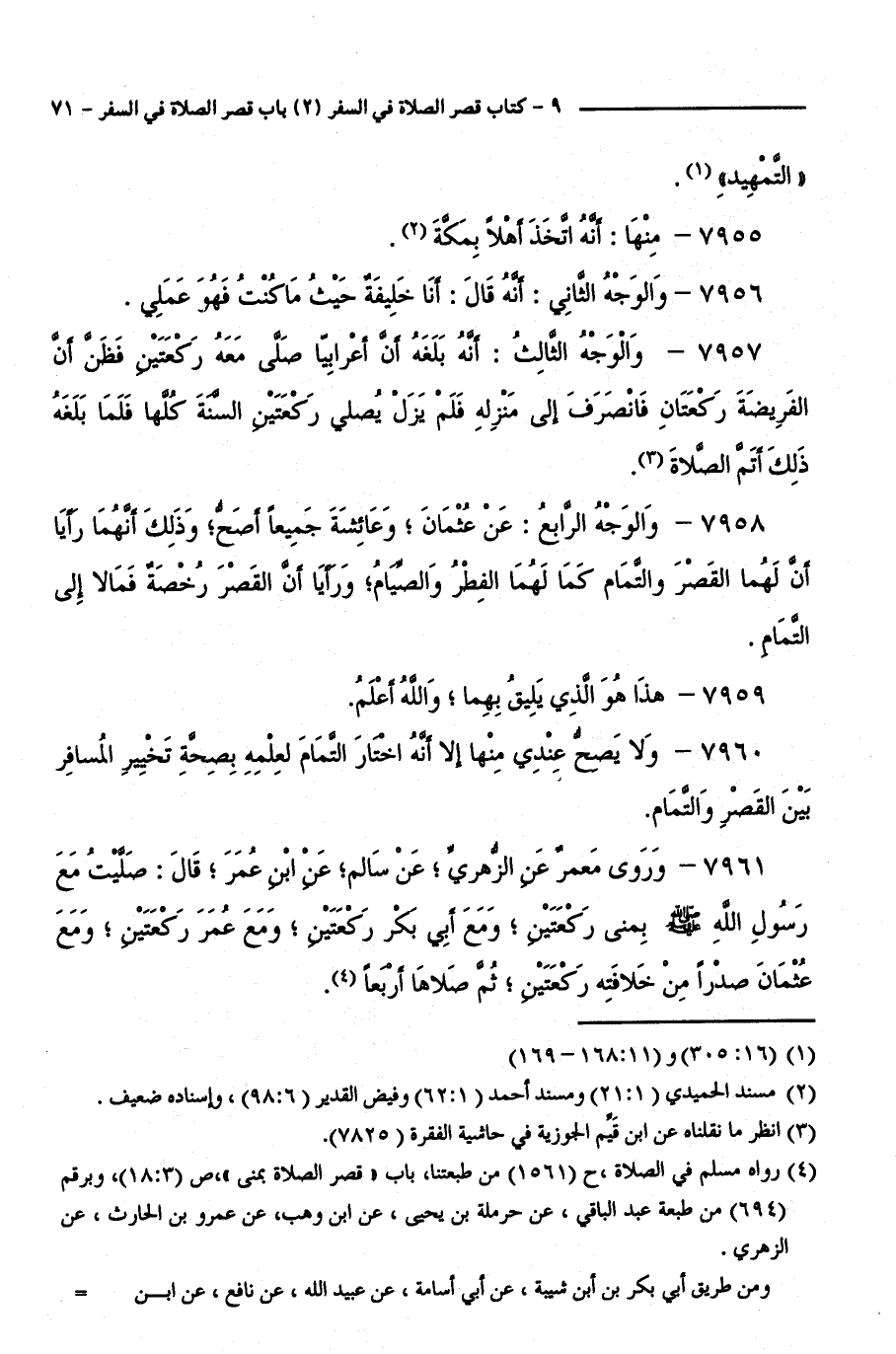 7957 - وَالْوَجْهُ الثَّالِثُ: أَنَّهُ بَلَغَهُ أَنَّ أَعْرَابِيًّا صَلَّى مَعَهُ رَكْعَتَيْنِ، فَظَنَّ أَنَّ الْفَرِيضَةَ رَكْعَتَانِ، فَانْصَرَفَ إِلَى مَنْزِلِهِ فَلَمْ يَزَلْ يُصَلِّي رَكْعَتَيْنِ السَّنَةَ كُلَّهَا فَلَمَّا بَلَغَهُ ذَلِكَ أَتَمَّ الصَّلَاةَ.