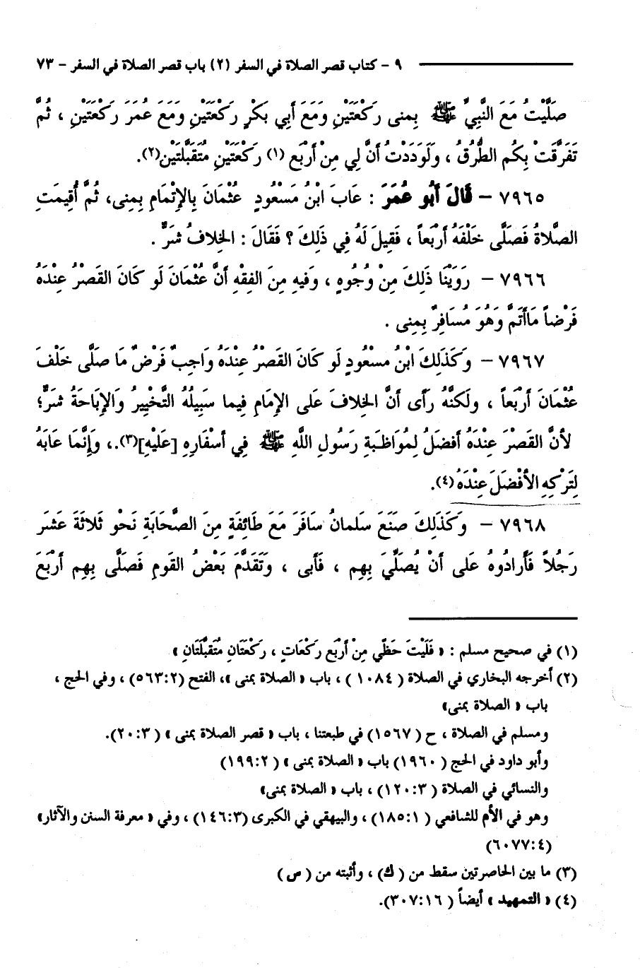 7966 - رَوَيْنَا ذَلِكَ مِنْ وُجُوهٍ، وَفِيهِ مِنَ الْفِقْهِ أَنَّ عُثْمَانَ لَوْ كَانَ الْقَصْرُ عِنْدَهُ فَرْضًا مَا أَتَمَّ وَهُوَ مُسَافِرٌ بِمِنًى.