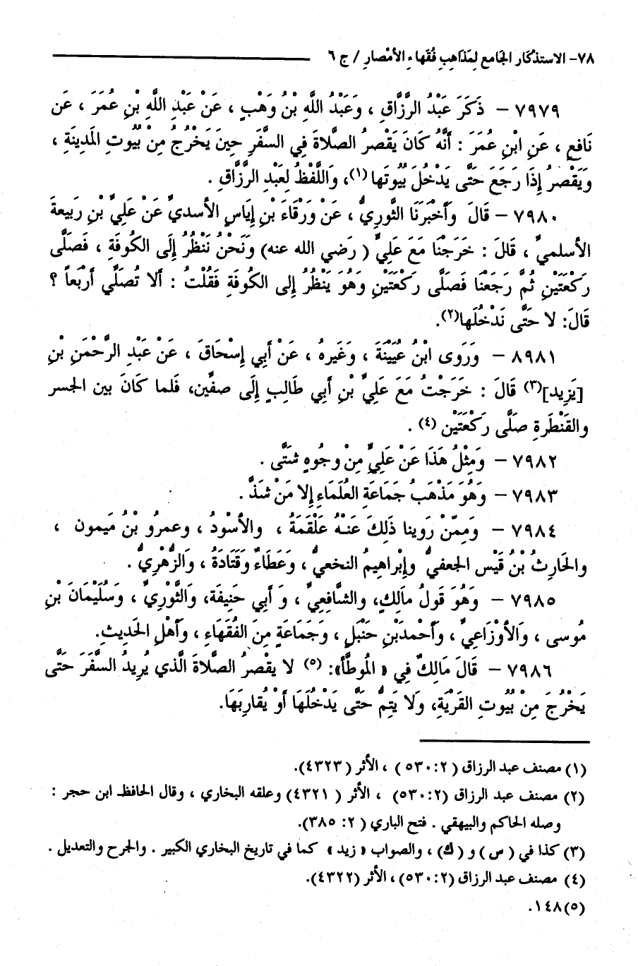 7979 - ذَكَرَ عَبْدُ الرَّزَّاقِ، وَعَبْدُ اللَّهِ بْنُ وَهْبٍ، عَنْ عَبْدِ اللَّهِ بْنِ عُمَرَ، عَنْ نَافِعٍ، عَنِ ابْنِ عُمَرَ: أَنَّهُ كَانَ يَقْصُرُ الصَّلَاةَ فِي السَّفَرِ حِينَ يَخْرُجُ مِنْ بُيُوتِ الْمَدِينَةِ، وَيَقْصُرُ إِذَا رَجَعَ حَتَّى يَدْخُلَ بُيُوتَهَا، وَاللَّفْظُ لِعَبْدِ الرَّزَّاقِ.