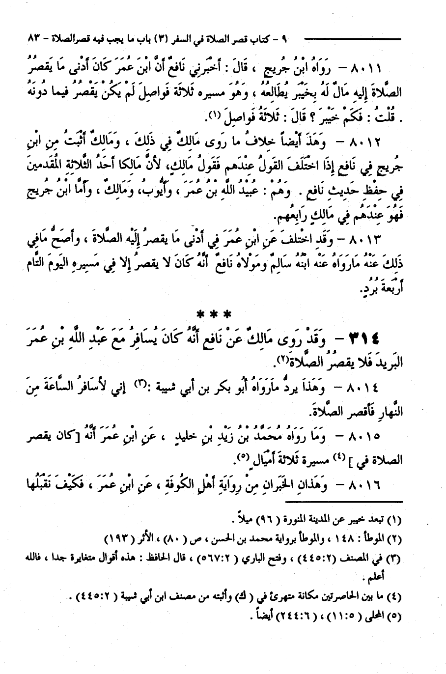 8011 - رَوَاهُ ابْنُ جُرَيْجٍ، قَالَ: أَخْبَرَنِي نَافِعٌ أَنَّ ابْنَ عُمَرَ كَانَ أَدْنَى مَا يَقْصُرُ الصَّلَاةَ إِلَيْهِ مَالٌ لَهُ بِخَيْبَرَ يُطَالِعُهُ، وَهُوَ مَسِيرَةُ ثَلَاثَةِ فَوَاصِلَ لَمْ يَكُنْ يَقْصُرُ فِيمَا دُونَهُ. قُلْتُ: فَكَمْ خَيْبَرُ ؟ قَالَ: ثَلَاثَةُ فَوَاصِلَ.