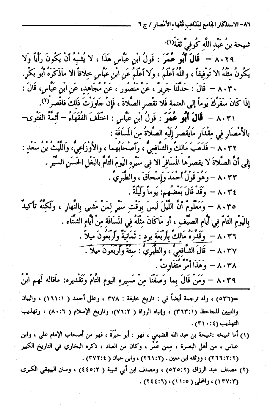 8031 - قَالَ أَبُو عُمَرَ: قَوْلُ ابْنِ عَبَّاسٍ: اخْتَلَفَ الْفُقَهَاءُ - أَئِمَّةُ الْفَتْوَى - بِالْأَمْصَارِ فِي مِقْدَارِ مَا يُقْصَرُ إِلَيْهِ الصَّلَاةُ مِنَ الْمَسَافَةِ: