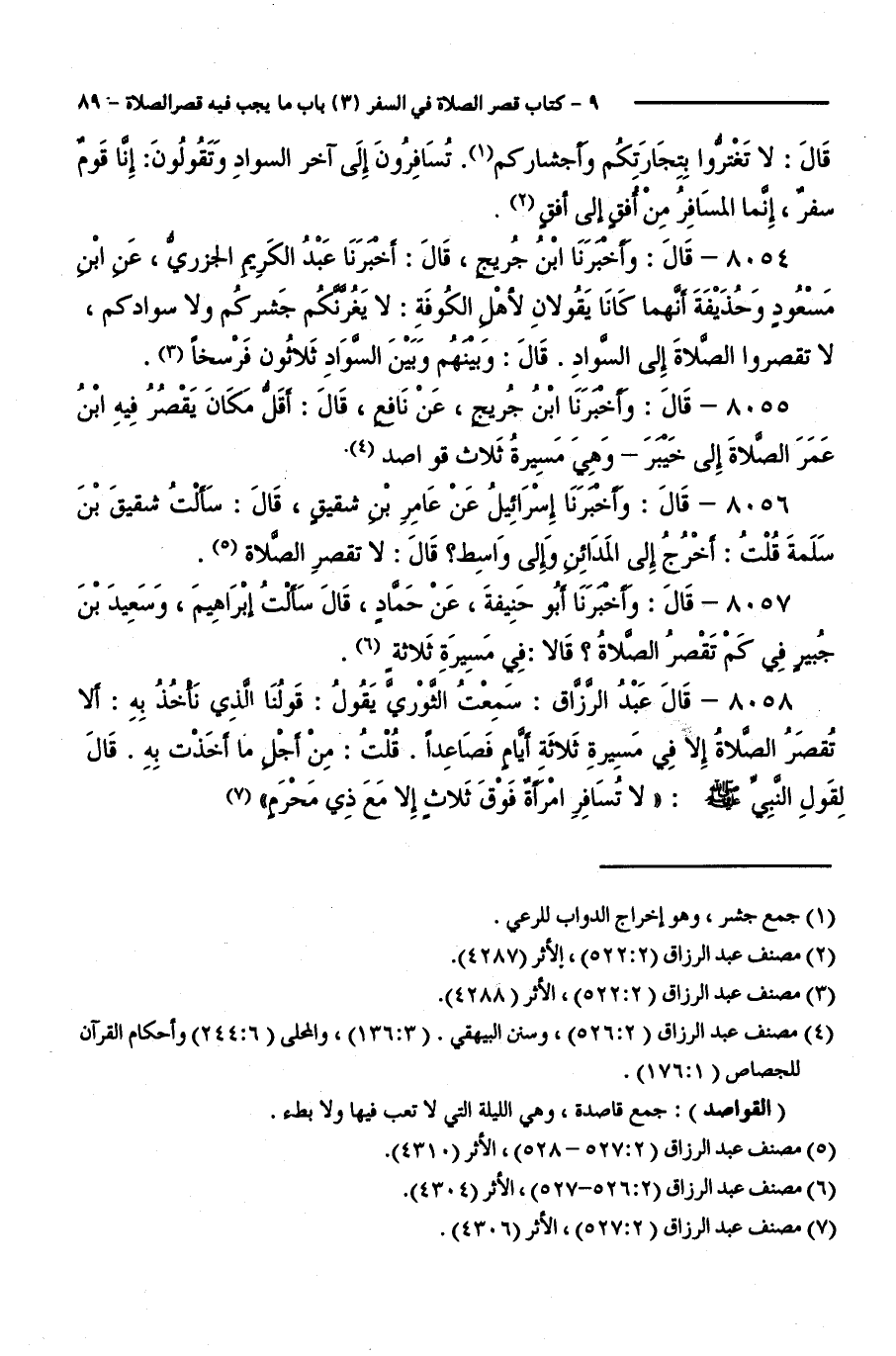 8054 - قَالَ: وَأَخْبَرَنَا ابْنُ جُرَيْجٍ، قَالَ: أَخْبَرَنَا عَبْدُ الْكَرِيمِ الْجَزَرِيُّ، عَنِ ابْنِ مَسْعُودٍ، وَحُذَيْفَةَ، أَنَّهُمَا كَانَا يَقُولَانِ لِأَهْلِ الْكُوفَةِ: لَا يَغُرَّنَّكُمْ جَشْرُكُمْ وَلَا سَوَادُكُمْ، لَا تَقْصُرُوا الصَّلَاةَ إِلَى السَّوَادِ. قَالَ: وَبَيْنَهُمْ وَبَيْنَ السَّوَادِ ثَلَاثُونَ فَرْسَخًا.