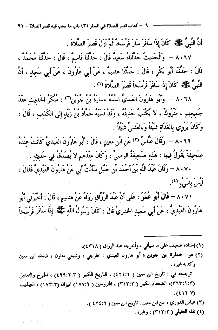 8071 - قَالَ أَبُو عُمَرَ: عَلَى أَنَّ عَبْدَ الرَّزَّاقِ رَوَاهُ عَنْ هُشَيْمٍ، قَالَ: أَخْبَرَنِي أَبُو هَارُونَ الْعَبْدِيُّ، عَنْ أَبِي سَعِيدٍ الْخُدْرِيِّ، قَالَ:كَانَ رَسُولُ اللَّهِ - صَلَّى اللَّهُ عَلَيْهِ وَسَلَّمَ - إِذَا سَافَرَ فَرْسَخًا