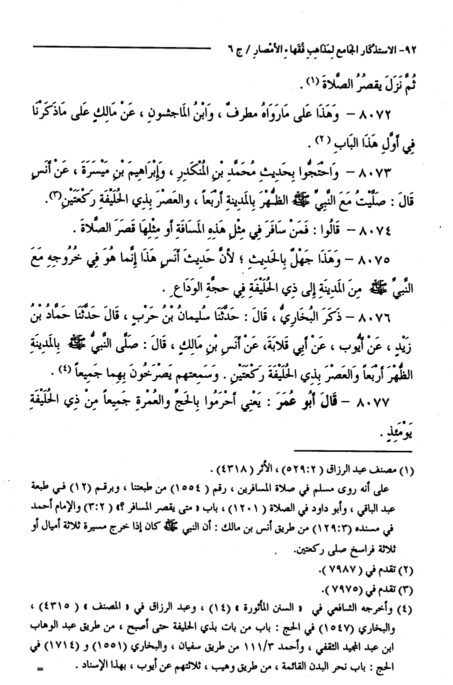 8073 - وَاحْتَجُّوا بِحَدِيثِ مُحَمَّدِ بْنِ الْمُنْكَدِرِ، وَإِبْرَاهِيمَ بْنِ مَيْسَرَةَ، عَنْ أَنَسٍ قَالَ:صَلَّيْتُ مَعَ النَّبِيِّ - صَلَّى اللَّهُ عَلَيْهِ وَسَلَّمَ - الظُّهْرَ بِالْمَدِينَةِ أَرْبَعًا، وَالْعَصْرَ بِذِي الْحُلَيْفَةِ رَكْعَتَيْنِ.