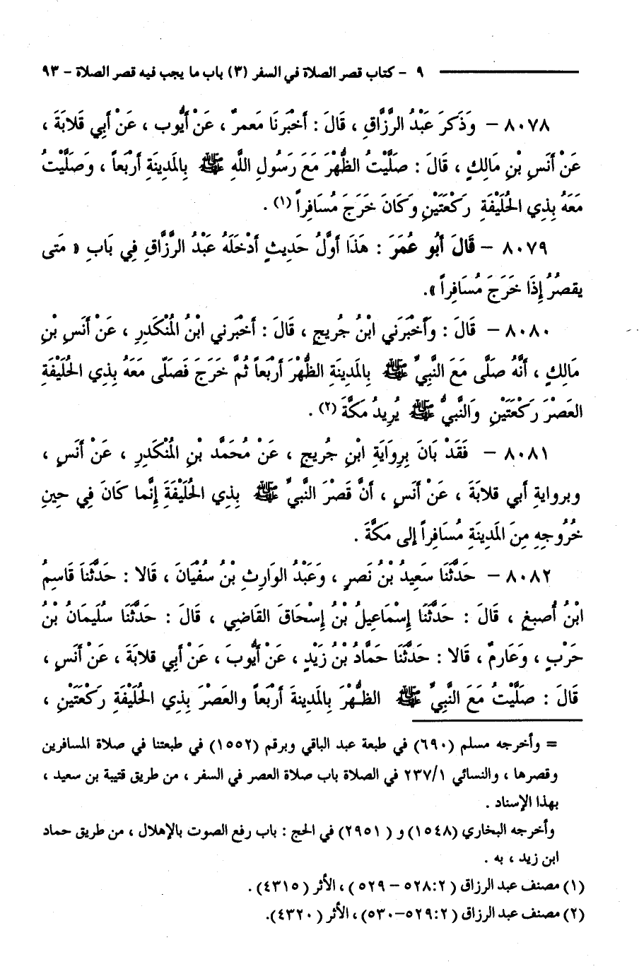 8078 - وَذَكَرَ عَبْدُ الرَّزَّاقِ، قَالَ: أَخْبَرَنَا مَعْمَرٌ، عَنْ أَيُّوبَ، عَنْ أَبِي قِلَابَةَ، عَنْ أَنَسِ بْنِ مَالِكٍ، قَالَ:صَلَّيْتُ الظُّهْرَ مَعَ رَسُولِ اللَّهِ - صَلَّى اللَّهُ عَلَيْهِ وَسَلَّمَ - بِالْمَدِينَةِ أَرْبَعًا، وَصَلَّيْتُ مَعَهُ بِذِي الْحُلَيْفَةِ رَكْعَتَيْنِ، وَكَانَ خَرَجَ مُسَافِرًا.