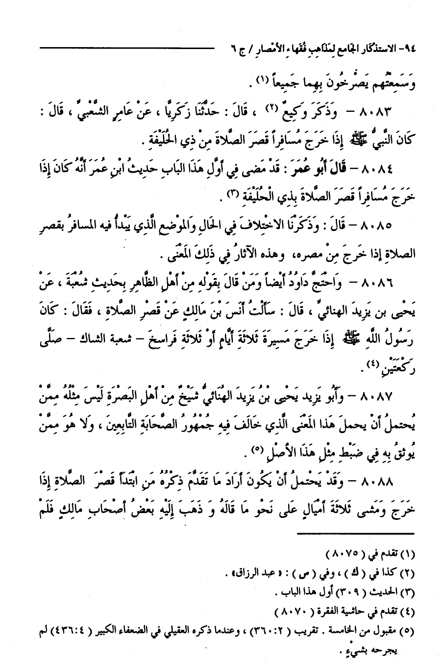 8085 - قَالَ: وَذَكَرْنَا الِاخْتِلَافَ فِي الْحَالِ وَالْمَوْضِعِ الَّذِي يَبْدَأُ فِيهِ الْمُسَافِرُ بِقَصْرِ الصَّلَاةِ إِذَا خَرَجَ مِنْ مِصْرِهِ، وَهَذِهِ الْآثَارُ فِي ذَلِكَ الْمَعْنَى.