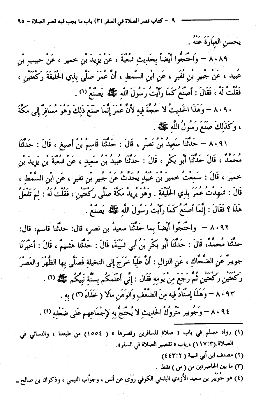 8091 - حَدَّثَنَا سَعِيدُ بْنُ نَصْرٍ، قَالَ: حَدَّثَنَا قَاسِمُ بْنُ أَصْبَغَ، قَالَ: حَدَّثَنَا مُحَمَّدٌ، قَالَ: حَدَّثَنَا أَبُو بَكْرٍ، قَالَ: حَدَّثَنَا عُبَيْدُ بْنُ سَعِيدٍ، عَنْ شُعْبَةَ عَنْ يَزِيدَ بْنِ خُمَيْرٍ، قَالَ: سَمِعْتُ حَبِيبَ بْنَ عُبَيْدٍ يُحَدِّثُ عَنْ جُبَيْرِ بْنِ نُفَيْرٍ، عَنِ ابْنِ السِّمْطِ، قَالَ:شَهِدْتُ عُمَرَ بِذِي الْحُلَيْفَةِ، وَهُوَ يُرِيدُ مَكَّةَ صَلَّى رَكْعَتَيْنِ، فَقُلْتُ لَهُ: لِمَ تَفْعَلُ هَذَا ؟ فَقَالَ: إِنَّمَا أَصْنَعُ كَمَا رَأَيْتُ رَسُولَ اللَّهِ - صَلَّى اللَّهُ عَلَيْهِ وَسَلَّمَ - يَصْنَعُ.