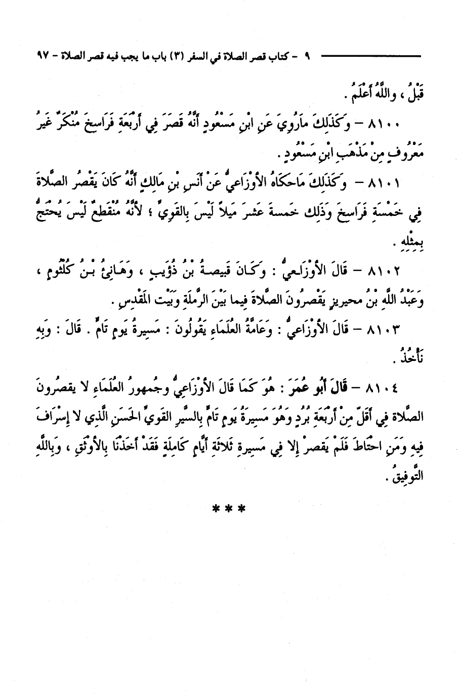 8104 - قَالَ أَبُو عُمَرَ: هُوَ كَمَا قَالَ الْأَوْزَاعِيُّ، وَجُمْهُورُ الْعُلَمَاءِ، لَا يَقْصُرُونَ الصَّلَاةَ فِي أَقَلِّ مِنْ أَرْبَعَةِ بُرُدٍ - وَهُوَ مَسِيرَةُ يَوْمٍ تَامٍّ بِالسَّيْرِ الْقَوِيِّ الْحَسَنِ الَّذِي لَا إِسْرَافَ فِيهِ، وَمَنِ احْتَاطَ فَلَمْ يَقْصُرْ إِلَّا فِي مَسِيرَةِ ثَلَاثَةِ أَيَّامٍ كَامِلَةٍ فَقَدْ أَخَذْنَا بِالْأَوْثَقِ، وَبِاللَّهِ التَّوْفِيقُ.