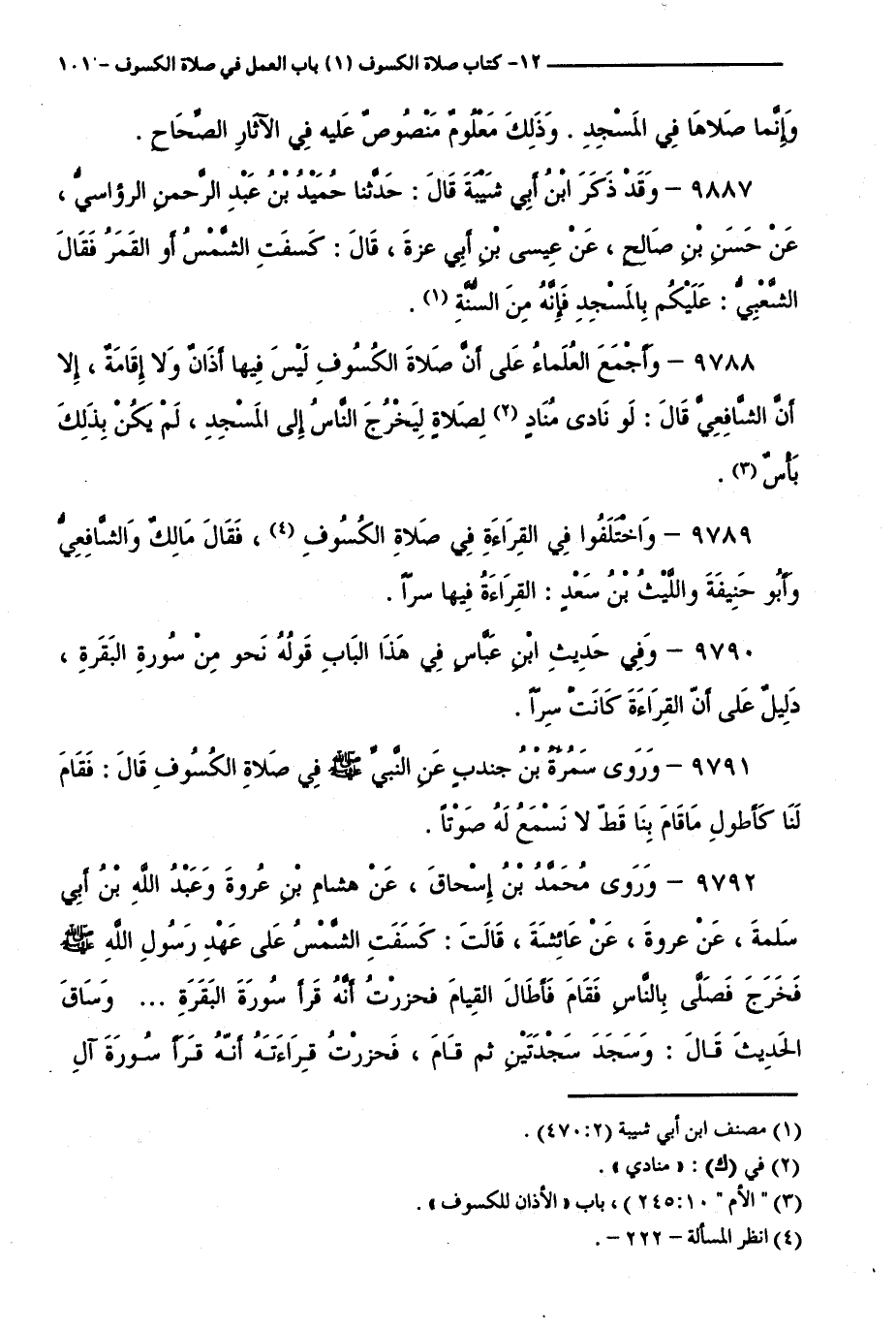 9789 - وَاخْتَلَفُوا فِي الْقِرَاءَةِ فِي صَلَاةِ الْكُسُوفِ، فَقَالَ مَالِكٌ وَالشَّافِعِيُّ وَأَبُو حَنِيفَةَ وَاللَّيْثُ بْنُ سَعْدٍ: الْقِرَاءَةُ فِيهَا سِرًّا.