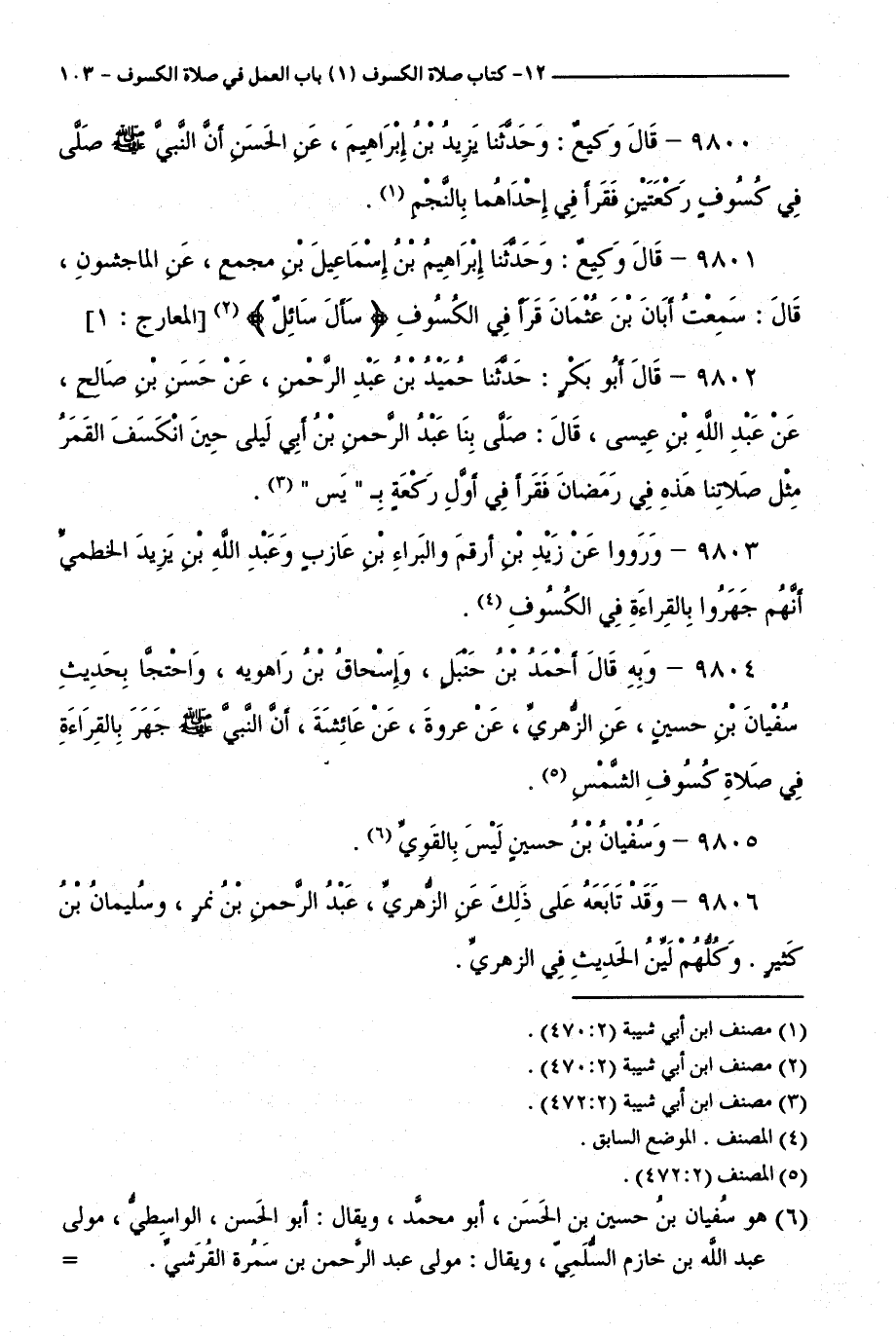 9803 - وَرَوَوْا عَنْ زَيْدِ بْنِ أَرْقَمَ، وَالْبَرَاءِ بْنِ عَازِبٍ، وَعَبْدِ اللَّهِ بْنِ يَزِيدَ الْخَطْمِيِّ أَنَّهُمْ جَهَرُوا بِالْقِرَاءَةِ فِي الْكُسُوفِ.