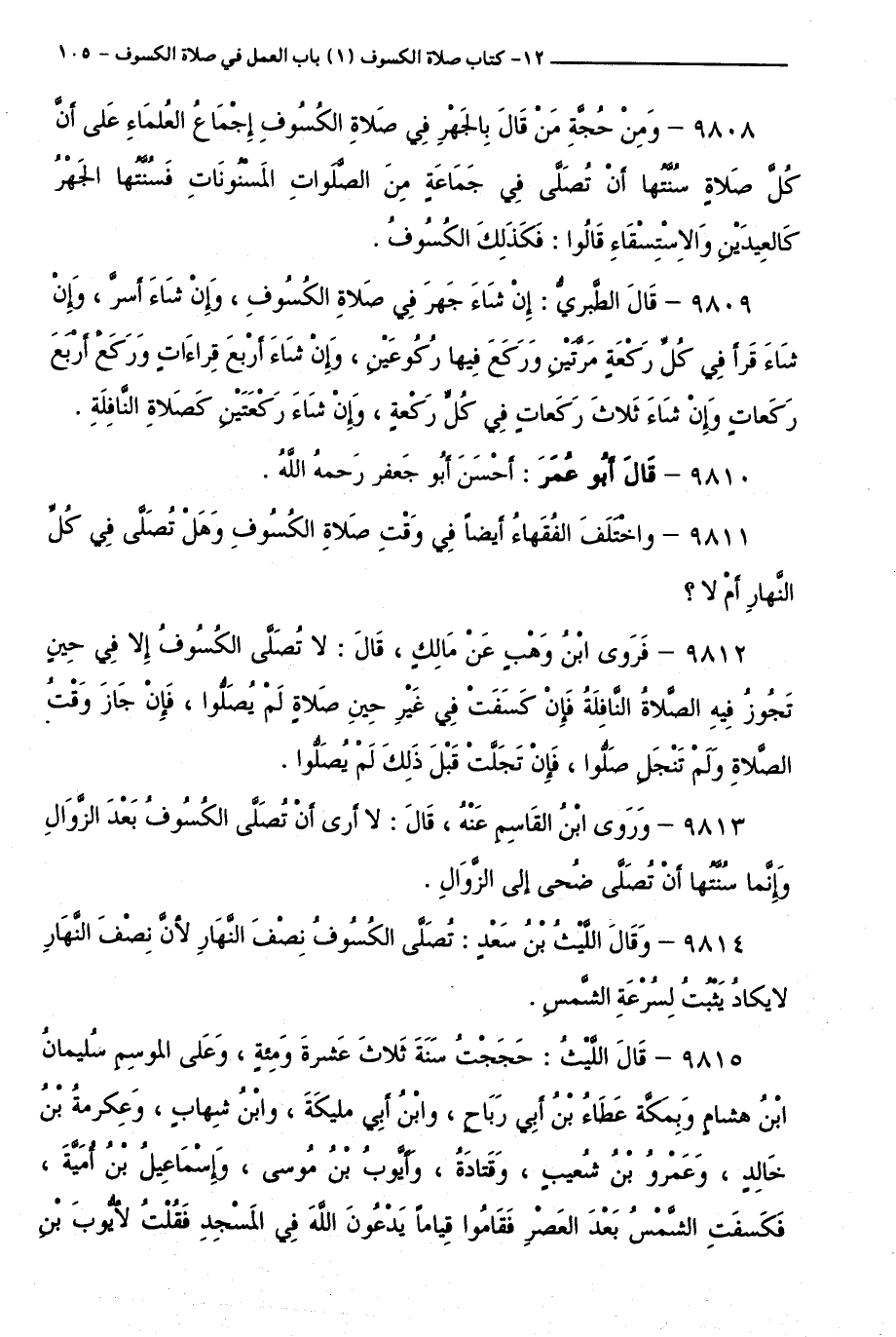 9808 - وَمِنْ حُجَّةِ مَنْ قَالَ بِالْجَهْرِ فِي صَلَاةِ الْكُسُوفِ إِجْمَاعُ الْعُلَمَاءِ عَلَى أَنَّ كُلَّ صَلَاةٍ سُنَّتُهَا أَنْ تُصَلَّى فِي جَمَاعَةٍ مِنَ الصَّلَوَاتِ الْمَسْنُونَاتِ فَسُنَّتُهَا الْجَهْرُ كَالْعِيدَيْنِ وَالِاسْتِسْقَاءِ قَالُوا: فَكَذَلِكَ الْكُسُوفُ.