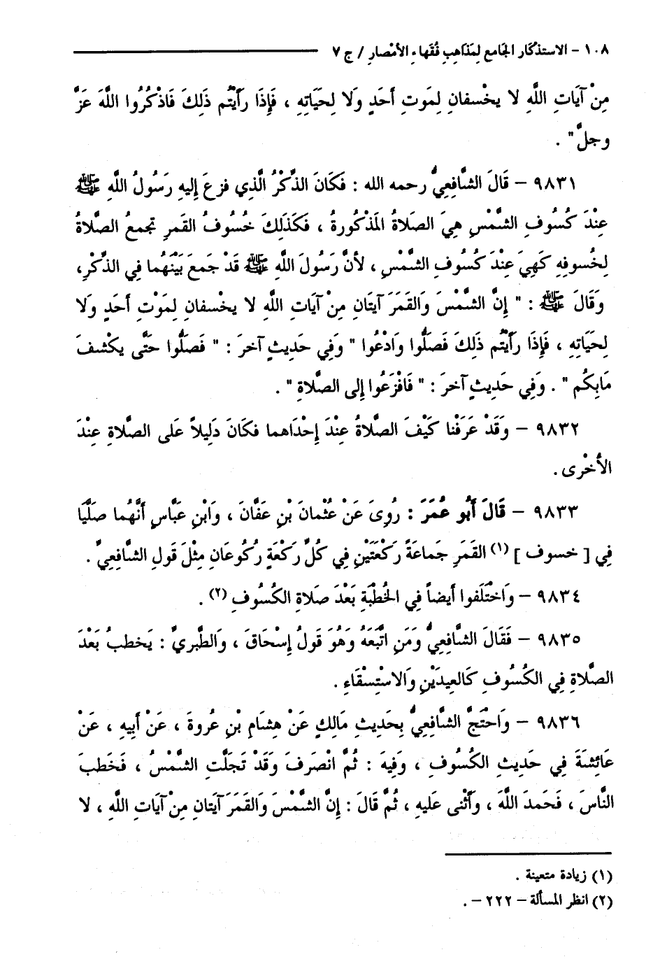 9833 - قَالَ أَبُو عُمَرَ: رُوِيَ عَنْ عُثْمَانَ بْنِ عَفَّانَ، وَابْنِ عَبَّاسٍ أَنَّهُمَا صَلَّيَا فِي خُسُوفِ الْقَمَرِ جَمَاعَةً رَكْعَتَيْنِ فِي كُلِّ رَكْعَةٍ رُكُوعَانِ مِثْلَ قَوْلِ الشَّافِعِيِّ.