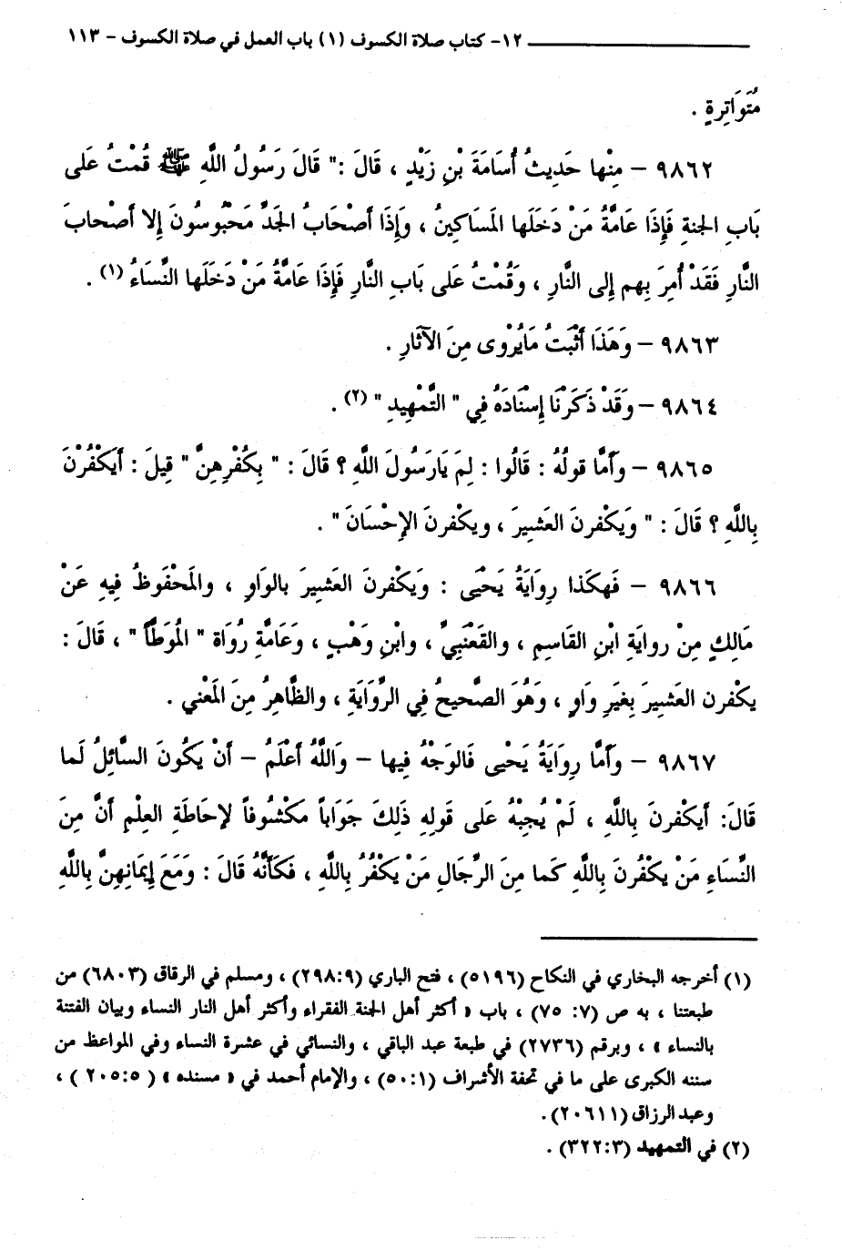 9866 - فَهَكَذَا رِوَايَةُ يَحْيَى: وَيَكْفُرْنَ الْعَشِيرَ بِالْوَاوِ، وَالْمَحْفُوظُ فِيهِ عَنْ مَالِكٍ مِنْ رِوَايَةِ ابْنِ الْقَاسِمِ، وَالْقَعْنَبِيِّ، وَابْنِ وَهْبٍ، وَعَامَّةِ رُوَاةِ " الْمُوَطَّأِ "، قَالَ: يَكْفُرْنَ الْعَشِيرَ بِغَيْرِ وَاوٍ، وَهُوَ الصَّحِيحُ فِي الرِّوَايَةِ، وَالظَّاهِرُ مِنَ الْمَعْنَى.