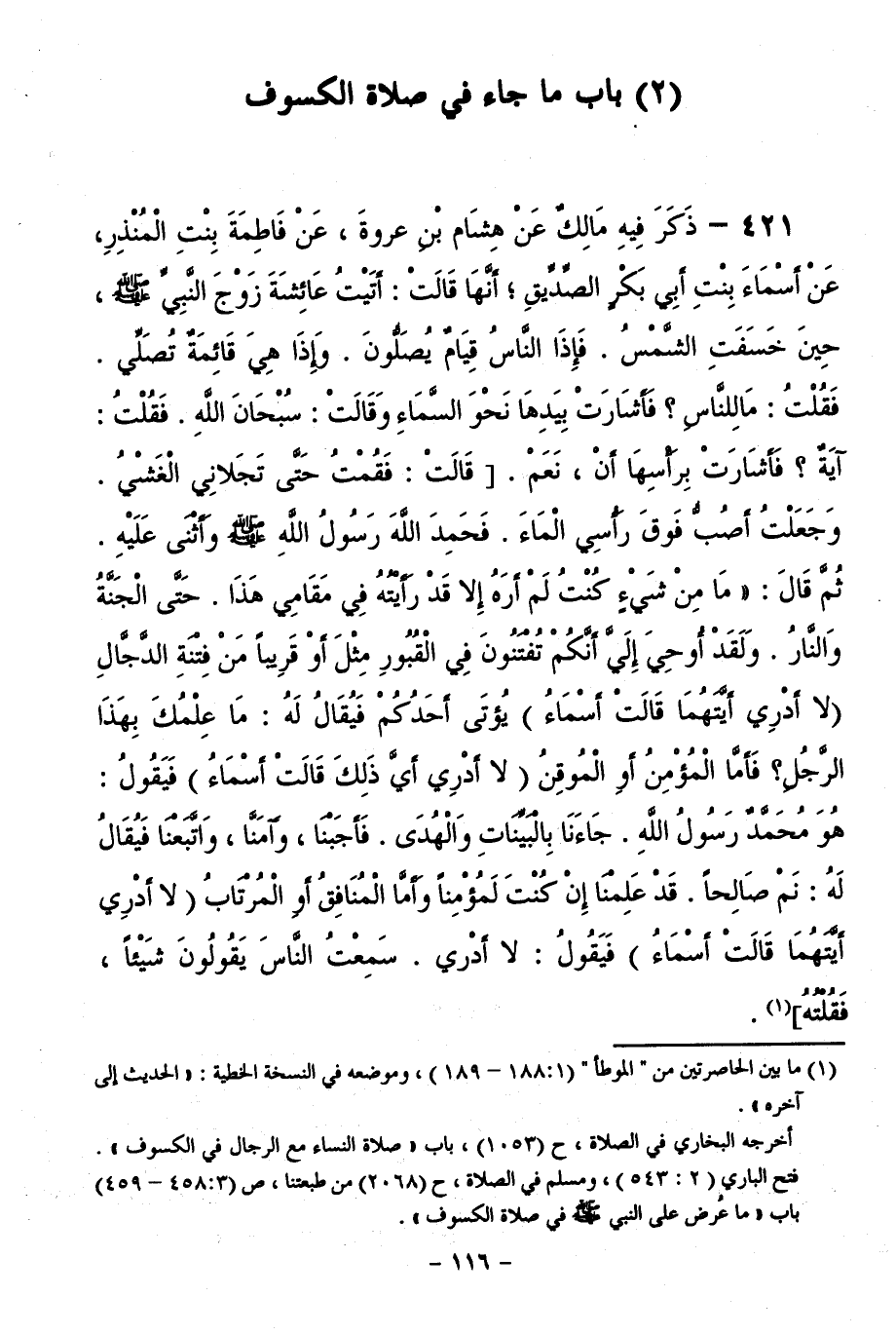 421 - ذَكَرَ فِيهِ مَالِكٌ عَنْ هِشَامِ بْنِ عُرْوَةَ، عَنْ فَاطِمَةَ بِنْتِ الْمُنْذِرِ، عَنْ أَسْمَاءَ بِنْتِ أَبِي بَكْرٍ الصِّدِّيقِ ; أَنَّهَا قَالَتْ:أَتَيْتُ عَائِشَةَ زَوْجَ النَّبِيِّ - صَلَّى اللَّهُ عَلَيْهِ وَسَلَّمَ - حِينَ خَسَفَتِ الشَّمْسُ. فَإِذَا النَّاسُ قِيَامٌ يُصَلُّونَ. وَإِذَا هِيَ قَائِمَةٌ تُصَلَّى. فَقُلْتُ: مَا لِلنَّاسِ ؟ فَأَشَارَتْ بِيَدِهَا نَحْوَ السَّمَاءِ وَقَالَتْ: سُبْحَانَ اللَّهِ ! فَقُلْتُ: آيَةٌ ؟ فَأَشَارَتْ بِرَأْسِهَا أَنْ نَعَمْ. قَالَتْ: فَقُمْتُ حَتَّى تُجِلَّانِي الْغَشْيُ. وَجَعَلْتُ أَصُبُّ فَوْقَ رَأْسِيَ الْمَاءَ. فَحَمِدَ اللَّهَ رَسُولُ اللَّهِ - صَلَّى اللَّهُ عَلَيْهِ وَسَلَّمَ - وَأَثْنَى عَلَيْهِ، ثُمَّ قَالَ: " مَا مِنْ شَيْءٍ كُنْتُ لَمْ أَرَهُ إِلَّا قَدْ رَأَيْتُهُ فِي مَقَامِي هَذَا. حَتَّى الْجَنَّةُ وَالنَّارُ. وَلَقَدْ أُوحِيَ إِلَيَّ أَنَّكُمْ تَفْتَنُونَ فِي الْقُبُورِ مِثْلَ أَوْ قَرِيبًا مِنْ فِتْنَةِ الدَّجَّالِ ( لَا أَدْرِي أَيَّتَهُمَا قَالَتْ أَسْمَاءُ ) يُؤْتَى أَحَدُكُمْ فَيُقَالُ لَهُ: مَا عِلْمُكَ بِهَذَا الرَّجُلِ فَأَمَّا الْمُؤْمِنُ أَوِ الْمُوقِنُ ( لَا أَدْرِي أَيَّ ذَلِكَ قَالَتْ أَسْمَاءُ ) فَيَقُولُ، هُوَ مُحَمَّدٌ رَسُولُ اللَّهِ. جَاءَنَا بِالْبَيِّنَاتِ وَالْهُدَى. فَأَجَبْنَا، وَآمَنَّا، وَاتَّبَعْنَا، فَيُقَالُ لَهُ: نَمْ صَالِحًا. قَدْ عَلِمْنَا إِنْ كُنْتَ لَمُؤْمِنًا. وَأَمَّا الْمُنَافِقُ أَوِ الْمُرْتَابُ ( لَا أَدْرِي أَيَّتَهُمَا قَالَتْ أَسْمَاءُ ) فَيَقُولُ: لَا أَدْرِي. سَمِعْتُ النَّاسَ يَقُولُونَ شَيْئًا، فَقُلْتُهُ.
