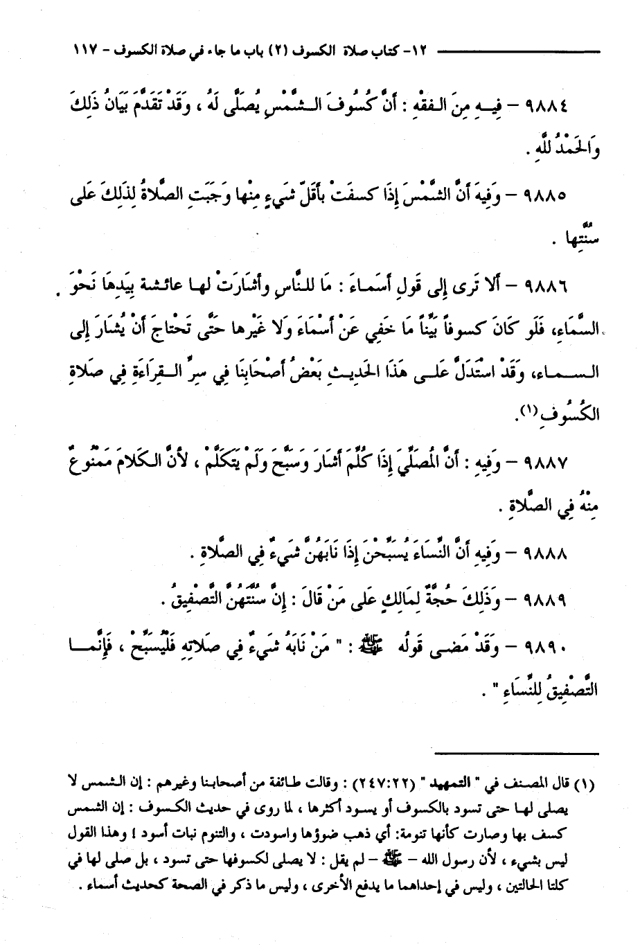 9885 - وَفِيهِ أَنَّ الشَّمْسَ إِذَا كَسَفَتْ بِأَقَلِّ شَيْءٍ مِنْهَا وَجَبَتِ الصَّلَاةُ لِذَلِكَ عَلَى سُنَّتِهَا.
