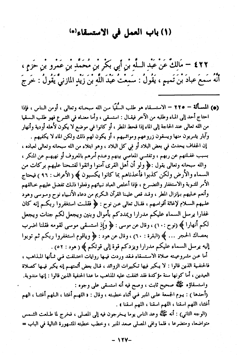 422 - مَالِكٌ عَنْ عَبْدِ اللَّهِ بْنِ أَبِي بَكْرِ بْنِ مُحَمَّدِ بْنِ عَمْرِو بْنِ حَزْمٍ، أَنَّهُ سَمِعَ عَبَّادَ بْنَ تَمِيمٍ، يَقُولُ: سَمِعْتُ عَبْدَ اللَّهِ بْنَ زَيْدٍ الْمَازِنِيَّ يَقُولُ،خَرَجَ