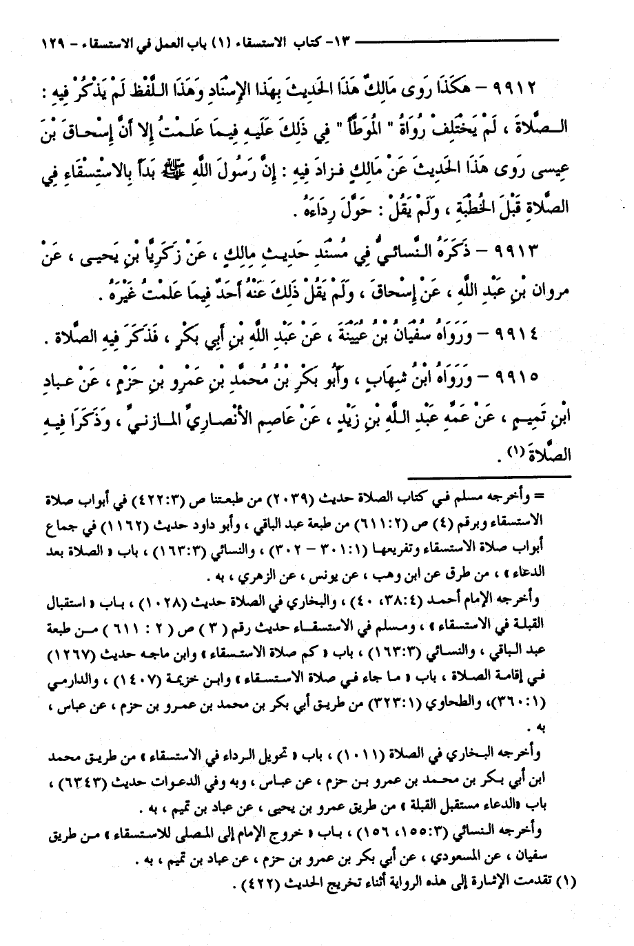 9912 - هَكَذَا رَوَى مَالِكٌ هَذَا الْحَدِيثَ بِهَذَا الْإِسْنَادِ وَهَذَا اللَّفْظِ لَمْ يَذْكُرْ فِيهِ: الصَّلَاةَ، لَمْ يَخْتَلِفْ رُوَاةُ " الْمُوَطَّأِ " فِي ذَلِكَ عَلَيْهِ فِيمَا عَلِمْتُ، إِلَّا أَنَّ إِسْحَاقَ بْنَ عِيسَى رَوَى هَذَا الْحَدِيثَ عَنْ مَالِكٍ فَزَادَ فِيهِ: إِنَّ رَسُولَ اللَّهِ - صَلَّى اللَّهُ عَلَيْهِ وَسَلَّمَ - بَدَأَ بِالِاسْتِسْقَاءِ فِي الصَّلَاةِ قَبْلَ الْخُطْبَةِ وَلَمْ يَقُلْ: حَوَّلَ رِدَاءَهُ.