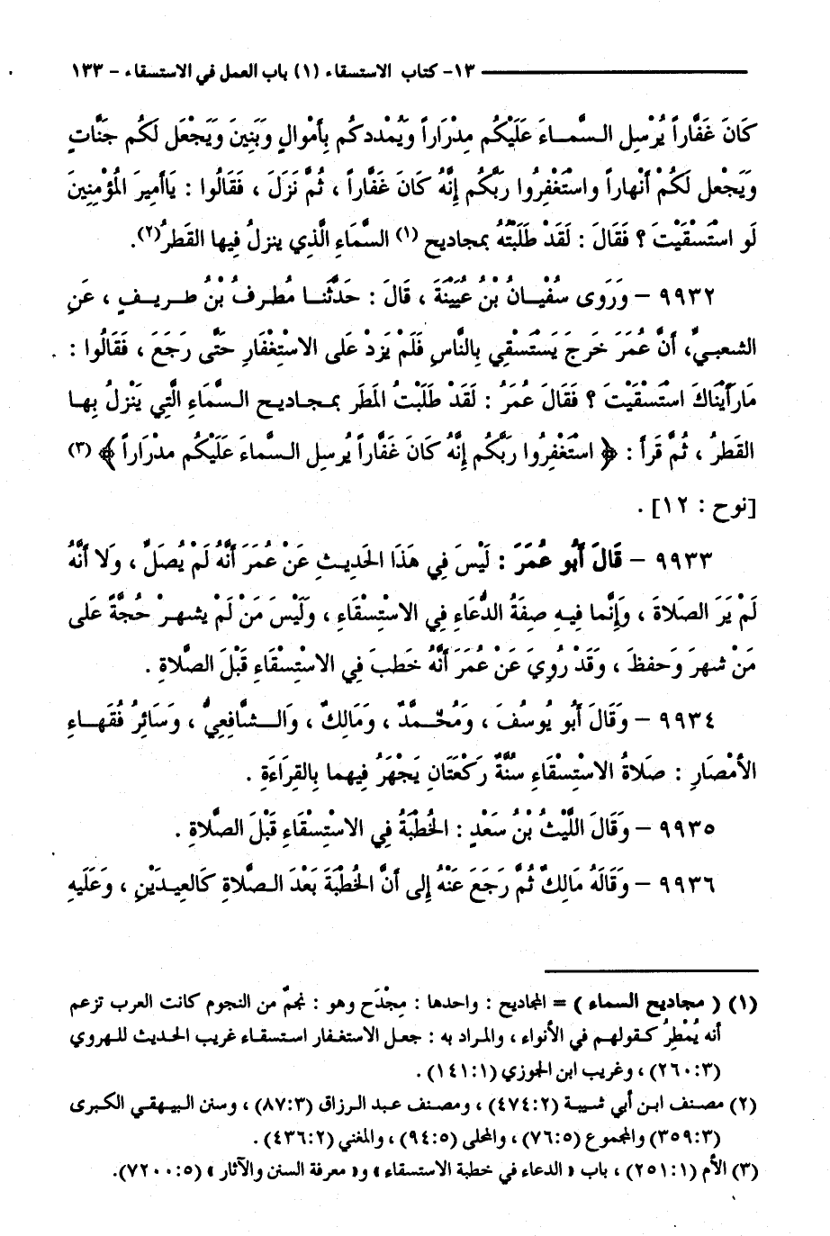 9932 - وَرَوَى سُفْيَانُ بْنُ عُيَيْنَةَ، قَالَ: حَدَّثَنَا مُطَرِّفُ بْنُ طَرِيفٍ، عَنِ الشَّعْبِيِّ، أَنَّ عُمَرَ خَرَجَ يَسْتَسْقِي بِالنَّاسِ فَلَمْ يَزِدْ عَلَى الِاسْتِغْفَارِ حَتَّى رَجَعَ فَقَالُوا: مَا رَأَيْنَاكَ اسْتَسْقَيْتَ ؟ فَقَالَ عُمَرُ: لَقَدْ طَلَبْتُ الْمَطَرَ بِمَجَادِيحِ السَّمَاءِ الَّتِي يَنْزِلُ بِهَا الْقَطْرُ ثُمَّ قَرَأَ: " اسْتَغْفِرُوا رَبَّكُمْ إِنَّهُ كَانَ غَفَّارًا يُرْسِلِ السَّمَاءَ عَلَيْكُمْ مِدْرَارًا " [ نُوحٍ: 12 ]