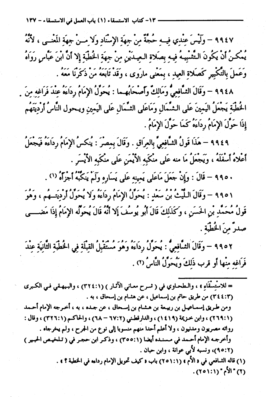 9948 - وَقَالَ الشَّافِعِيُّ، وَمَالِكٌ، وَأَصْحَابُهُمَا: يُحَوِّلُ الْإِمَامُ رِدَاءَهُ عِنْدَ فَرَاغِهِ مِنَ الْخُطْبَةِ يَجْعَلُ الْيَمِينَ عَلَى الشِّمَالِ، وَمَا عَلَى الشِّمَالِ عَلَى الْيَمِينِ. وَيَحُوِّلُ النَّاسُ أَرْدِيَتَهُمْ إِذَا حَوَّلَ الْإِمَامُ رِدَاءَهُ كَمَا حَوَّلَ الْإِمَامُ.