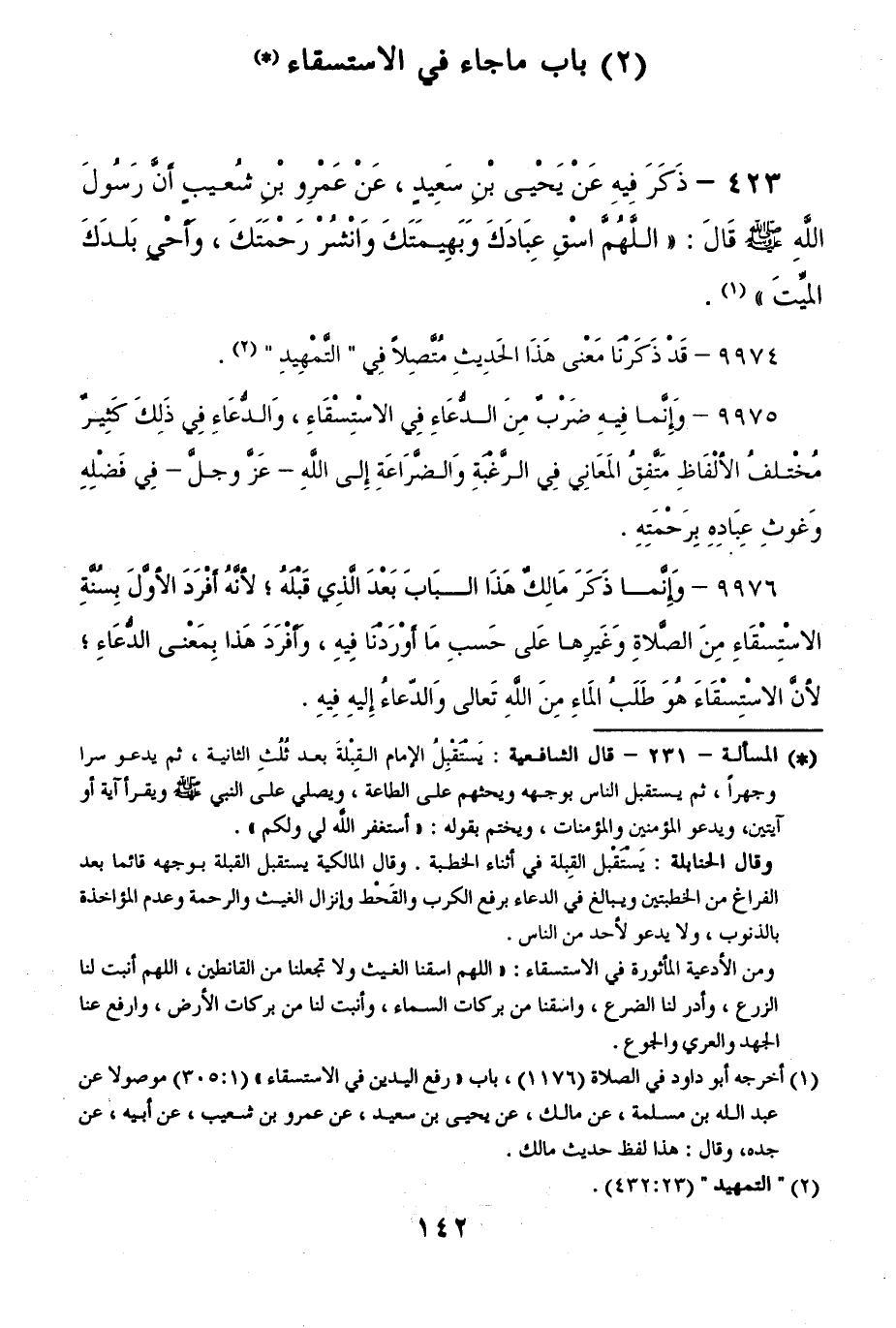 423 - ذَكَرَ فِيهِ عَنْ يَحْيَى بْنِ سَعِيدٍ، عَنْ عَمْرِو بْنِ شُعَيْبٍ أَنَّ رَسُولَ اللَّهِ - صَلَّى اللَّهُ عَلَيْهِ وَسَلَّمَ - قَالَ: "اللَّهُمَّ اسْقِ عِبَادَكَ وَبَهِيمَتَكَ وَانْشُرْ رَحْمَتَكَ، وَأَحْيِ بَلَدَكَ الْمَيِّتَ ".
