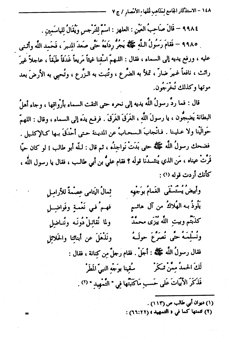 فَضَحِكَ رَسُولُ اللَّهِ - صَلَّى اللَّهُ عَلَيْهِ وَسَلَّمَ - حَتَّى بَدَتْ نَوَاجِذُهُ، ثُمَّ قَالَ: لِلَّهِ أَبُو طَالِبٍ ! لَوْ كَانَ حَيًّا قَرَّتْ عَيْنَاهُ، مَنِ الَّذِي يُنْشِدُنَا قَوْلَهُ ؟ فَقَامَ عَلِيُّ بْنُ أَبِي طَالِبٍ، فَقَالَ: يَا رَسُولَ اللَّهِ، كَأَنَّكَ أَرَدْتَ قَوْلَهُ: