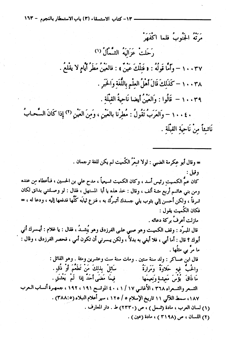 10040 - وَالْعَرَبُ تَقُولُ: مُطِرْنَا بِالْعَيْنِ، وَمِنَ الْعَيْنِ إِذَا كَانَ السَّحَابُ نَاشِئًا مِنْ نَاحِيَةِ الْقِبْلَةِ.