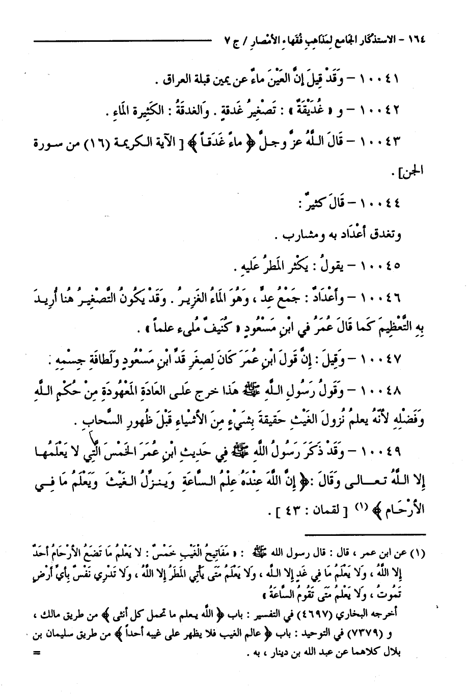 10049 - وَقَدْ ذَكَرَ رَسُولُ اللَّهِ - صَلَّى اللَّهُ عَلَيْهِ وَسَلَّمَ - فِي حَدِيثِ ابْنِ عُمَرَ الْخَمْسَ الَّتِي لَا يَعْلَمُهَا إِلَّا اللَّهُ تَعَالَى وَقَالَ: (إِنَّ اللَّهَ عِنْدَهُ عِلْمُ السَّاعَةِ وَيُنَزِّلُ الْغَيْثَ وَيَعْلَمُ مَا فِي الْأَرْحَامِ ) [ لُقْمَانَ: 43 ].