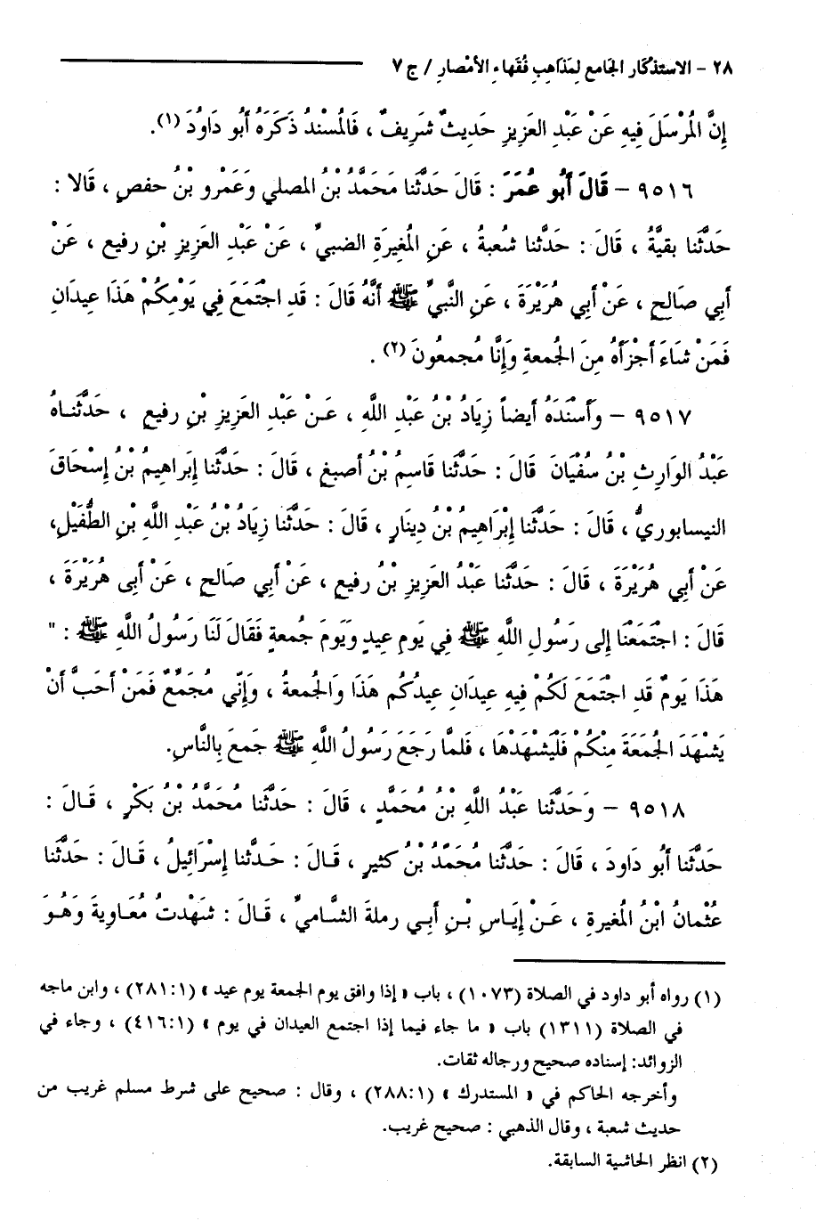 9516 - قَالَ أَبُو عُمَرَ: قَالَ حَدَّثَنَا مُحَمَّدُ بْنُ الْمُصَلِّي، وَعَمْرُو بْنُ حَفْصٍ، قَالَا: حَدَّثَنَا بَقِيَّةُ، قَالَ: حَدَّثْنَا شُعْبَةُ، عَنِ الْمُغِيرَةِ الضَّبِّيِّ، عَنْ عَبْدِ الْعَزِيزِ بْنِ رُفَيْعٍ، عَنْ أَبِي صَالِحٍ، عَنْ أَبِي هُرَيْرَةَ، عَنِ النَّبِيِّ - صَلَّى اللَّهُ عَلَيْهِ وَسَلَّمَ - أَنَّهُ قَالَقَدِ اجْتَمَعَ فِي يَوْمِكُمْ هَذَا عِيدَانِ فَمَنْ شَاءَ أَجَزَّأَهُ مِنَ الْجُمُعَةِ وَإِنَّا مُجْمِعُونَ.