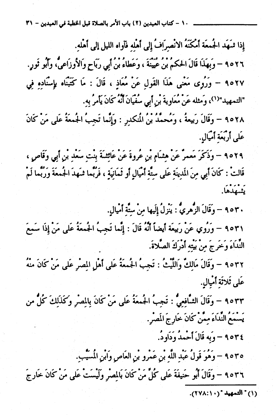 9532 - وَقَالَ مَالِكٌ وَاللَّيْثٌ: تَجِبُ الْجُمُعَةُ عَلَى أَهْلِ الْمِصْرِ عَلَى مَنْ كَانَ مِنْهُ عَلَى ثَلَاثَةِ أَمْيَالٍ.