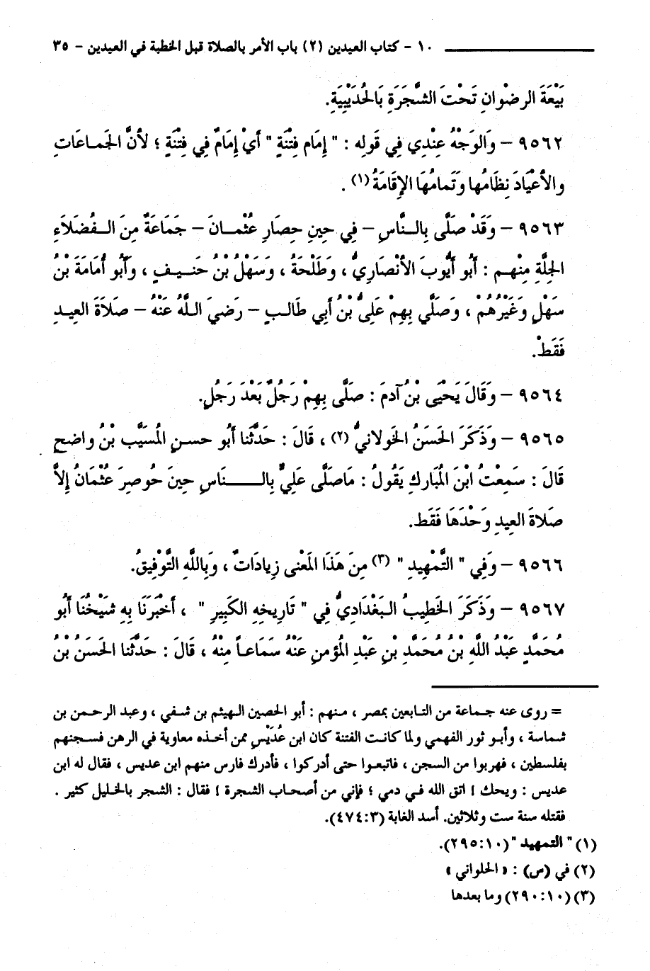 9563 - وَقَدْ صَلَّى بِالنَّاسِ فِي حِينِ حِصَارِ عُثْمَانَ جَمَاعَةٌ مِنَ الْفُضَلَاءِ الْجِلَّةِ مِنْهُمْ: أَبُو أَيُّوبَ الْأَنْصَارِيُّ، وَطَلْحَةُ، وَسَهْلُ بْنُ حُنَيْفٍ، وَأَبُو أُمَامَةَ بْنُ سَهْلٍ، وَغَيْرُهُمْ، وَصَلَّى بِهِمْ عَلِيُّ بْنُ أَبِي طَالِبٍ - رَضِيَ اللَّهُ عَنْهُ - صَلَاةَ الْعِيدِ فَقَطْ