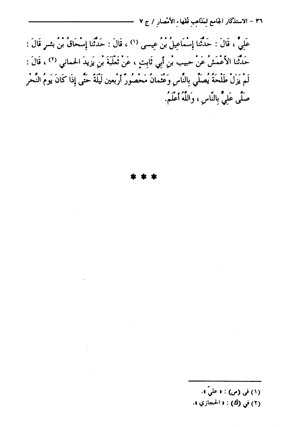 عَلِيٍّ، قَالَ: حَدَّثَنَا إِسْمَاعِيلُ بْنُ عِيسَى، قَالَ: حَدَّثَنَا إِسْحَاقُ بْنُ بِشْرٍ، قَالَ: حَدَّثَنَا الْأَعْمَشُ عَنْ حَبِيبِ بْنِ أَبِي ثَابِتٍ، عَنْ ثَعْلَبَةَ بْنِ يَزِيدَ الْحِمَّانِيِّ، قَالَ: لَمْ يَزَلْ طَلْحَةُ يُصَلِّي بِالنَّاسِ وَعُثْمَانُ مَحْصُورٌ أَرْبَعِينَ لَيْلَةً حَتَّى إِذَا كَانَ يَوْمُ النَّحْرِ صَلَّى عَلِيٌّ بِالنَّاسِ، وَاللَّهُ أَعْلَمُ.