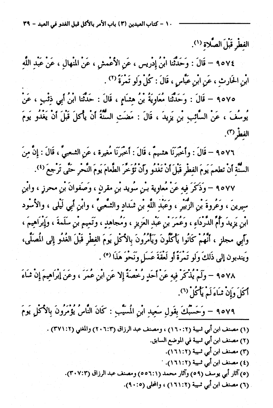 9576 - قَالَ: وَأَخْبَرَنَا هُشَيْمٌ، قَالَ: أَخْبَرْنَا مُغِيرَةُ عَنِ الشَّعْبِيِّ، قَالَ:إِنَّ مِنَ السُّنَّةِ أَنْ تَطْعَمَ يَوْمَ الْفِطْرِ قَبْلَ أَنْ تَغْدُوَ وَأَنْ تُؤَخِّرَ الطَّعَامَ يَوْمَ النَّحْرِ حَتَّى تَرْجِعَ.