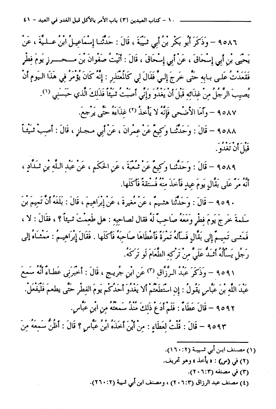 9586 - وَذَكَرَ أَبُو بَكْرِ بْنُ أَبِي شَيْبَةَ، قَالَ: حَدَّثَنَا إِسْمَاعِيلُ ابْنُ عُلَيَّةَ، عَنْ يَحْيَى بْنِ أَبِي إِسْحَاقَ، عَنْ أَبِي إِسْحَاقَ، قَالَ: أَتَيْتُ صَفْوَانَ بْنَ مُحْرِزٍ يَوْمَ فِطْرٍ فَقَعَدْتُ عَلَى بَابِهِ حَتَّى خَرَجَ إِلَيَّ فَقَالَ لِي كَالْمُعْتَذِرِ: إِنَّهُ كَانَ يُؤْمَرُ فِي هَذَا الْيَوْمِ أَنْ يُصِيبَ الرَّجُلُ مِنْ غِذَائِهِ قَبْلَ أَنْ يَغْدُوَ وَإِنِّي أَصَبْتُ شَيْئًا فَذَلِكَ الَّذِي حَبَسَنِي.
