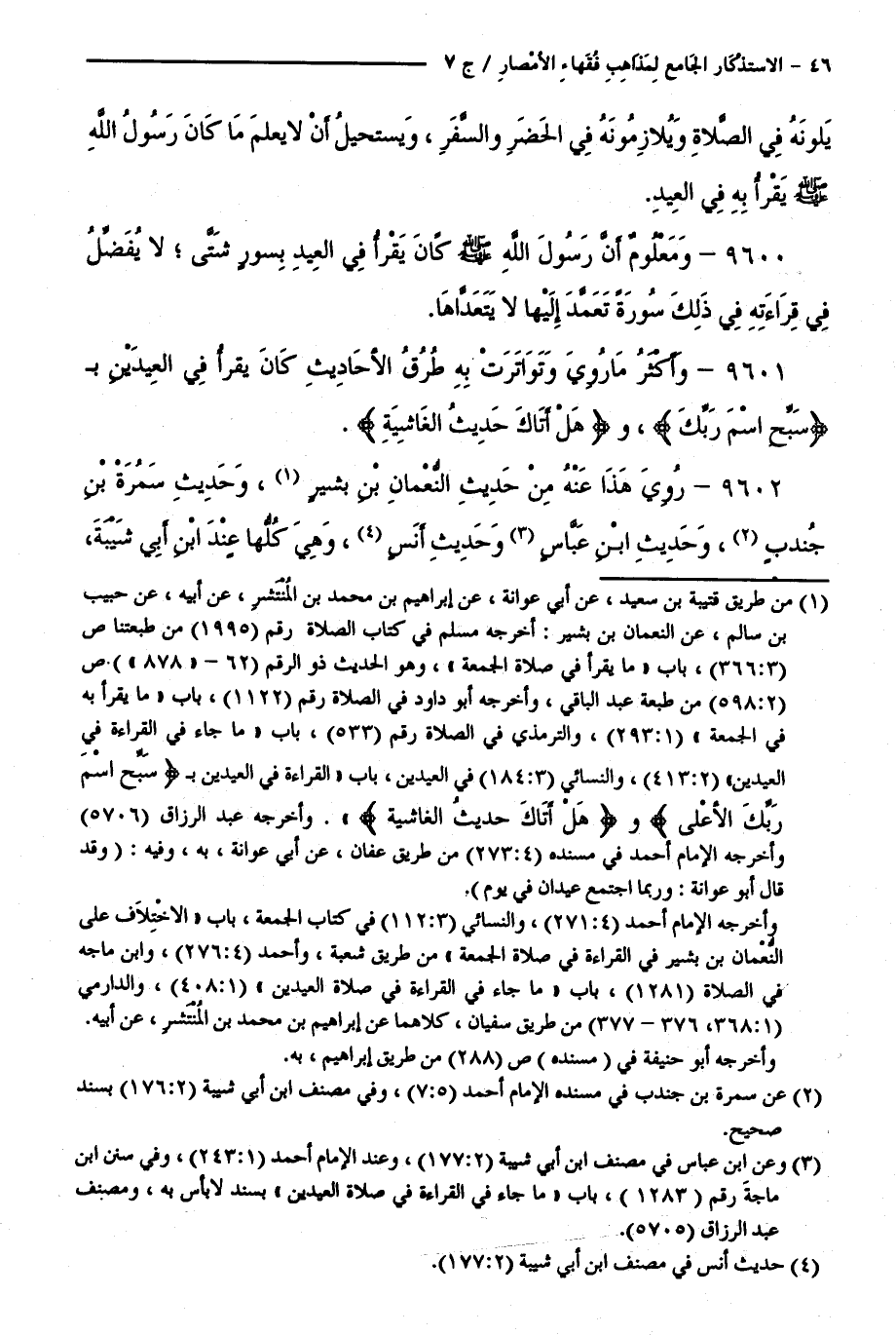 9601 - وَأَكْثَرُ مَا رُوِيَ وَتَوَاتَرَتْ بِهِ طُرُقُ الْأَحَادِيثِ كَانَ يَقْرَأُ فِي الْعِيدَيْنِ بِ "سَبِّحِ اسْمَ رَبِّكَ " وَ "هَلْ أَتَاكَ حَدِيثُ الْغَاشِيَةِ ".