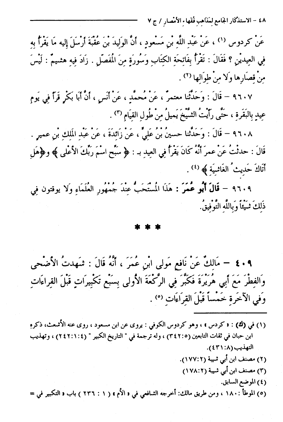 409 - مَالِكٌ عَنْ نَافِعٍ مَوْلَى ابْنِ عُمَرَ، أَنَّهُ قَالَ: شَهِدْتُ الْأَضْحَى وَالْفِطْرَ مَعَ أَبِي هُرَيْرَةَ فَكَبَّرَ فِي الرَّكْعَةِ الْأَوْلَى بِسَبْعِ تَكْبِيرَاتٍ قَبْلَ الْقِرَاءَاتِ وَفِي الْآخِرَةِ خَمْسًا قَبْلَ الْقِرَاءَاتِ.