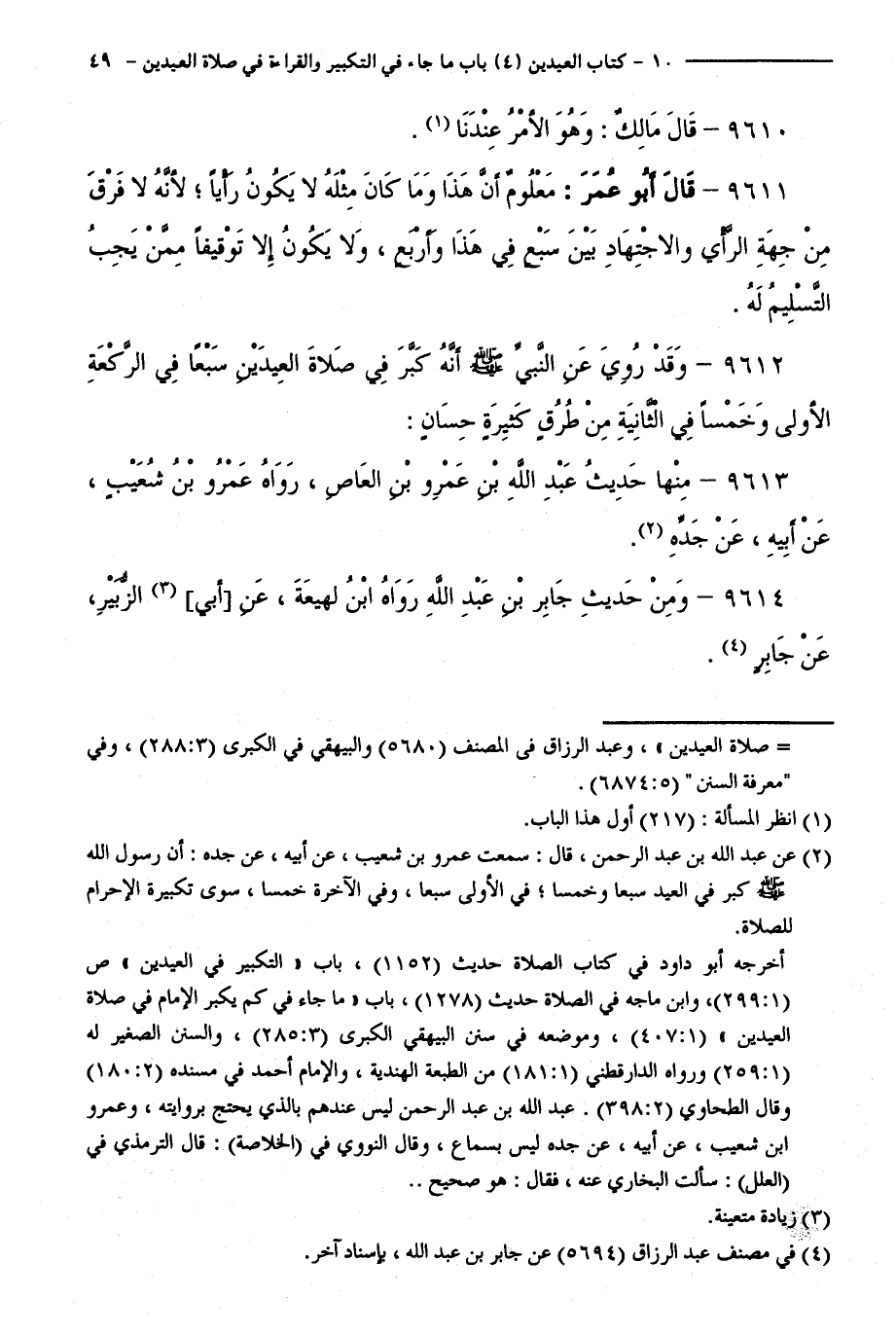 9612 - وَقَدْ رُوِيَ عَنِ النَّبِيِّ - صَلَّى اللَّهُ عَلَيْهِ وَسَلَّمَ - أَنَّهُ كَبَّرَ فِي صَلَاةِ الْعِيدَيْنِ سَبْعًا فِي الرَّكْعَةِ الْأُولَى وَخَمْسًا فِي الثَّانِيَةِ مِنْ طُرُقٍ كَثِيرَةٍ حِسَانٍ:.
