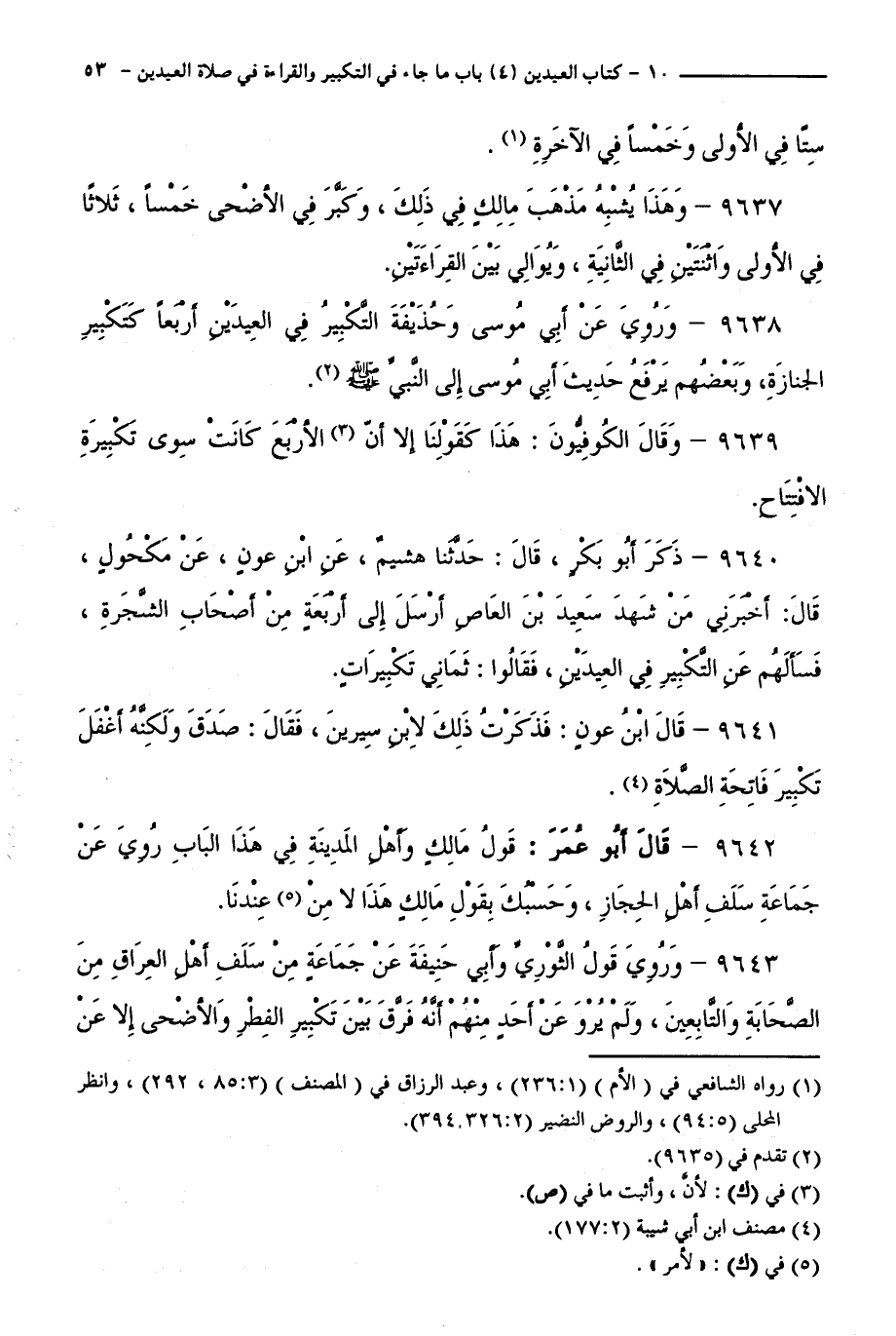 9643 - وَرُوِيَ قَوْلُ الثَّوْرِيِّ وَأَبِي حَنِيفَةَ عَنْ جَمَاعَةٍ مِنْ سَلَفِ أَهْلِ الْعِرَاقِ مِنَ الصَّحَابَةِ وَالتَّابِعِينَ، وَلَمْ يُرْوَ عَنْ أَحَدٍ مِنْهُمْ أَنَّهُ فَرَّقَ بَيْنَ تَكْبِيرِ الْفِطْرِ وَالْأَضْحَى إِلَّا عَنْ