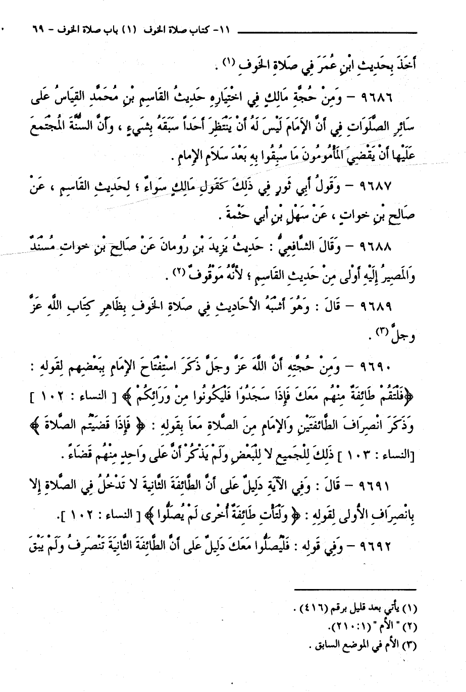 9692 - قَالَ: وَفِي الْآيَةِ دَلِيلٌ عَلَى أَنَّ الطَّائِفَةَ الثَّانِيَةَ لَا تَدْخُلُ فِي الصَّلَاةِ إِلَّا بِانْصِرَافِ الْأُولَى لِقَوْلِهِ: "وَلْتَأْتِ طَائِفَةٌ أُخْرَى لَمْ يُصَلُّوا " [النِّسَاءِ: 102].