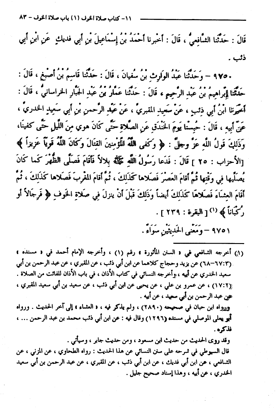 9750 - وَحَدَّثَنَا عَبْدُ الْوَارِثِ بْنُ سُفْيَانَ، قَالَ: حَدَّثَنَا قَاسِمُ بْنُ أَصْبَغَ، قَالَ: حَدَّثَنَا إِبْرَاهِيمُ بْنُ عَبْدِ الرَّحِيمِ، قَالَ: حَدَّثَنَا عَمَّارُ بْنُ عَبْدِ الْجَبَّارِ الْخُراَسَانِيُّ، قَالَ: أَخْبَرَنَا ابْنُ أَبِي ذِئْبٍ، عَنْ سَعِيدٍ الْمَقْبُرِيِّ، عَنْ عَبْدِ الرَّحْمَنِ بْنِ أَبِي سَعِيدٍ الْخُدْرِيِّ، عَنْ أَبِيهِ، قَالَ: حُبِسْنَا يَوْمَ الْخَنْدَقِ عَنِ الصَّلَاةِ حَتَّى كَانَ هَوِيَ مِنَ اللَّيْلِ حَتَّى كُفِينَا وَذَلِكَ قَوْلُ اللَّهِ - عَزَّ وَجَلَّ - "وَكَفَى اللَّهُ الْمُؤْمِنِينَ الْقِتَالَ وَكَانَ اللَّهُ قَوِيًّا عَزِيزًا " [الْأَحْزَابِ: 25] قَالَ: فَدَعَا رَسُولُ اللَّهِ - صَلَّى اللَّهُ عَلَيْهِ وَسَلَّمَ - بِلَالًا فَأَقَامَ فَصَلَّى الظُّهْرَ كَمَا كَانَ يُصَلِّيهَا فِي وَقْتِهَا ثُمَّ أَقَامَ الْعَصْرَ فَصَلَّاهَا كَذَلِكَ، ثُمَّ أَقَامَ الْمَغْرِبَ فَصَلَّاهَا كَذَلِكَ، ثُمَّ أَقَامَ الْعِشَاءَ فَصَلَّاهَا كَذَلِكَ أَيْضًا، وَذَلِكَ قَبْلَ أَنْ يَنْزِلَ فِي صَلَاةِ الْخَوْفِ (فَرِجَالًا أَوْ رُكْبَانًا) [الْبَقَرَةِ: 239].