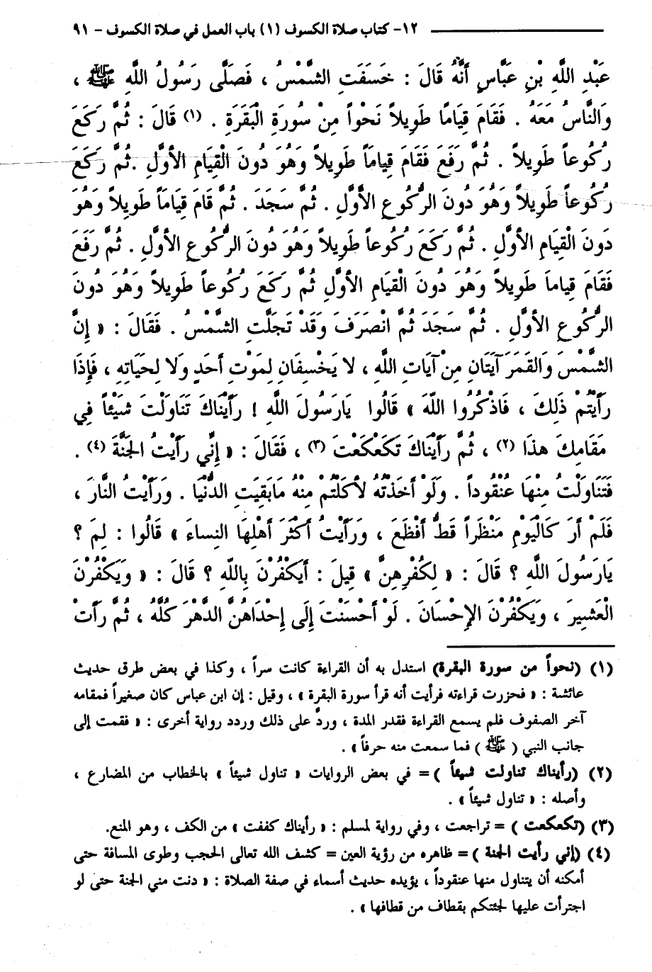 عَبْدِ اللَّهِ بْنِ عَبَّاسٍ أَنَّهُ قَالَ:خَسَفَتِ الشَّمْسُ فَصَلَّى رَسُولُ اللَّهِ - صَلَّى اللَّهُ عَلَيْهِ وَسَلَّمَ - وَالنَّاسُ مَعَهُ. فَقَامَ قِيَامًا طَوِيلًا نَحْوًا مِنْ سُورَةِ الْبَقَرَةِ. قَالَ: ثُمَّ رَكَعَ رُكُوعًا طَوِيلًا. ثُمَّ رَفَعَ فَقَامَ قِيَامًا طَوِيلًا وَهُوَ دُونَ الْقِيَامِ الْأَوَّلِ. ثُمَّ رَكَعَ رُكُوعًا طَوِيلًا وَهُوَ دُونَ الرُّكُوعِ الْأَوَّلِ، ثُمَّ سَجَدَ، ثُمَّ قَامَ قِيَامًا طَوِيلًا وَهُوَ دُونَ الْقِيَامِ الْأَوَّلِ. ثُمَّ رَكَعَ رُكُوعًا طَوِيلًا وَهُوَ دُونَ الرُّكُوعِ الْأَوَّلِ. ثُمَّ رَفَعَ فَقَامَ قِيَامًا طَوِيلًا وَهُوَ دُونَ الْقِيَامِ الْأَوَّلِ ثُمَّ رَكَعَ رُكُوعًا طَوِيلًا وَهُوَ دُونَ الرُّكُوعِ الْأَوَّلِ. ثُمَّ سَجَدَ ثُمَّ انْصَرَفَ وَقَدْ تَجَلَّتِ الشَّمْسُ. فَقَالَ: " إِنَّ الشَّمْسَ وَالْقَمَرَ آيَتَانِ مِنْ آيَاتِ اللَّهِ، لَا يَخْسِفَانِ لِمَوْتِ أَحَدٍ وَلَا لِحَيَاتِهِ، فَإِذَا رَأَيْتُمْ ذَلِكَ فَاذْكُرُوا اللَّهَ " قَالُوا: يَا رَسُولَ اللَّهِ رَأَيْنَاكَ تَنَاوَلْتَ شَيْئًا فِي مَقَامِكَ هَذَا، ثُمَّ رَأَيْنَاكَ تَكَعْكَعْتَ، فَقَالَ: " إِنِّي رَأَيْتُ الْجَنَّةَ فَتَنَاوَلْتُ مِنْهَا عُنْقُودًا. وَلَوْ أَخَذْتُهُ لَأَكَلْتُمْ مِنْهُ مَا بَقِيَتِ الدُّنْيَا. وَرَأَيْتُ النَّارَ، فَلَمْ أَرَ كَالْيَوْمِ مَنْظَرًا قَطُّ أَفْظَعَ، وَرَأَيْتُ أَكْثَرَ أَهْلِهَا النِّسَاءَ " قَالُوا: لِمَ يَا رَسُولَ اللَّهِ ؟ قَالَ: " لِكُفْرِهِنَّ، قِيلَ: أَيَكْفُرْنَ بِاللَّهِ ؟ ! قَالَ: " وَيَكْفُرْنَ الْعَشِيرَ، وَيَكْفُرْنَ الْإِحْسَانَ. لَوْ أَحْسَنْتَ إِلَى إِحْدَاهُنَّ الدَّهْرَ كُلَّهُ، ثُمَّ رَأَتْ