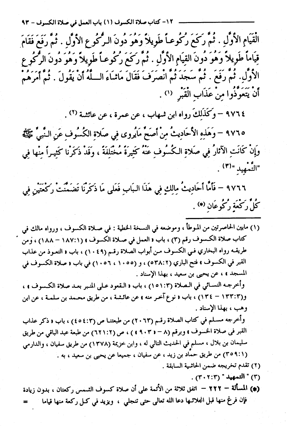 9766 - فَأَمَّا أَحَادِيثُ مَالِكٍ فِي هَذَا الْبَابِ فَعَلَى مَا ذَكَرْنَا تَضَمَّنَتْ رَكْعَتَيْنِ فِي كُلِّ رَكْعَةٍ رُكُوعَانِ.