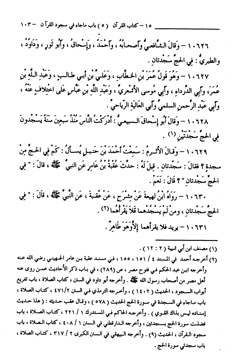 10626 - وَقَالَ الشَّافِعِيُّ وَأَصْحَابُهُ، وَأَحْمَدُ، وَإِسْحَاقُ، وَأَبُو ثَوْرٍ، وَدَاوُدُ، وَالطَّبَرَيُّ: فِي الْحَجِّ سَجْدَتَانِ.