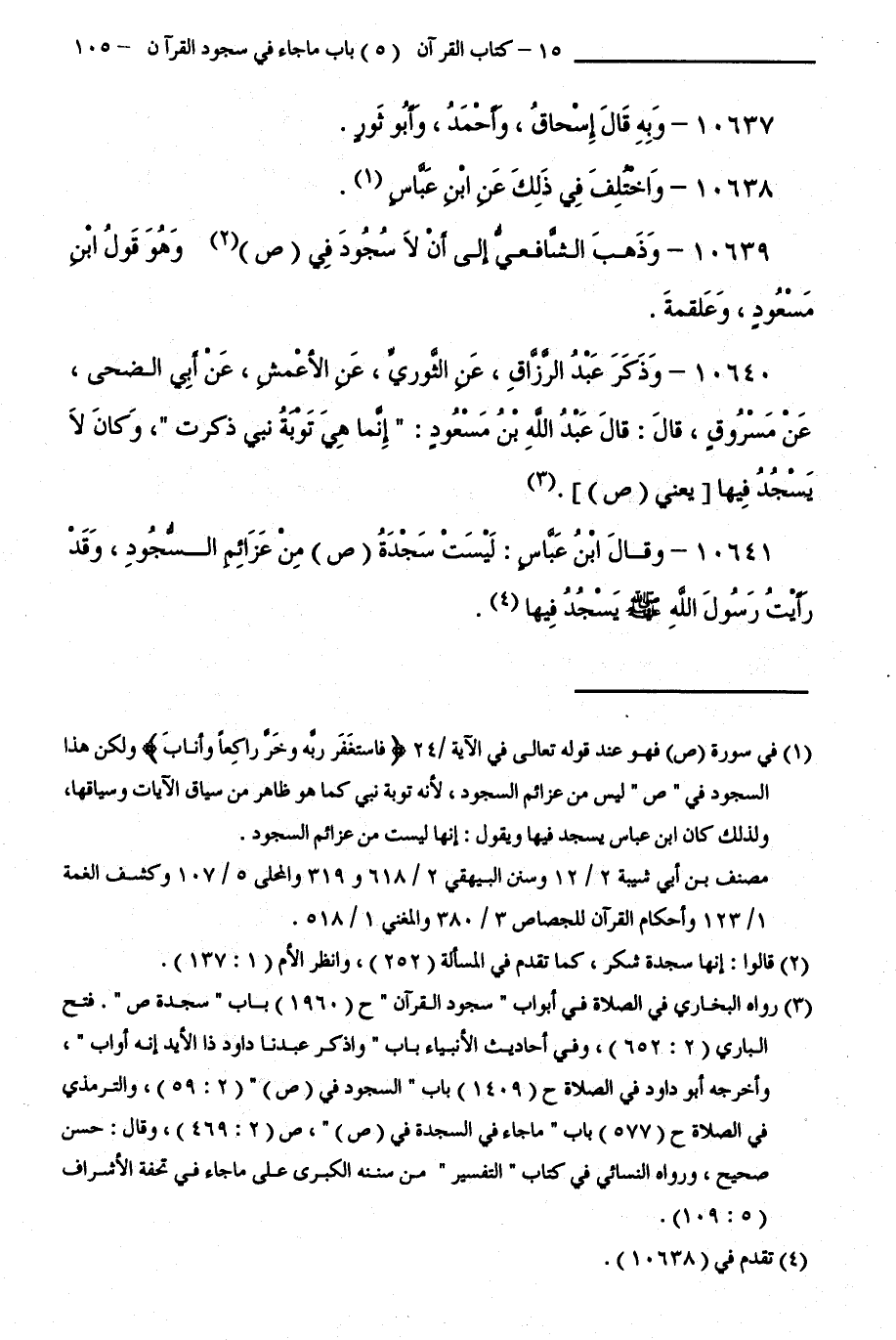 10639 - وَذَهَبَ الشَّافِعِيُّ إِلَى أَنْ لَا سُجُودَ فِي ( ص )، وَهُوَ قَوْلُ ابْنِ مَسْعُودٍ وَعَلْقَمَةَ.