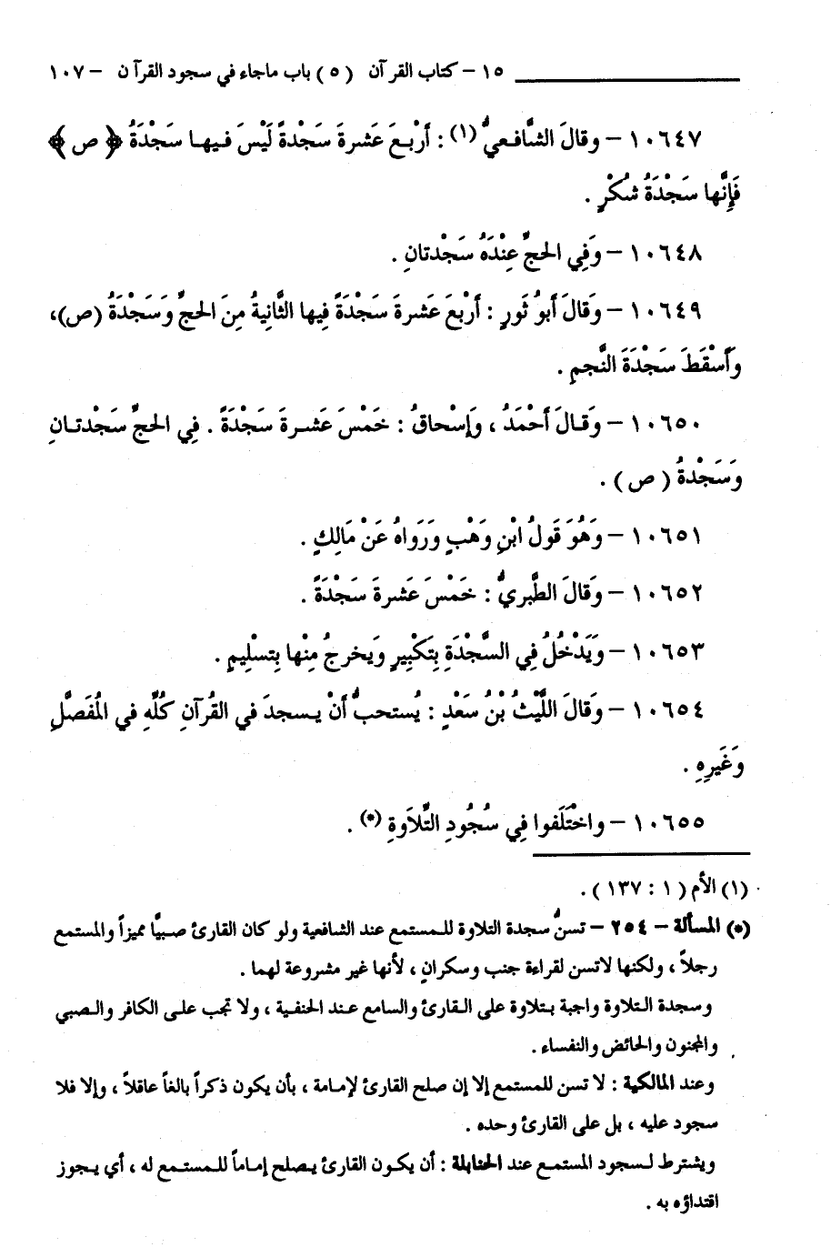 10647 - وَقَالَ الشَّافِعِيُّ: أَرْبَعَ عَشْرَةَ سَجْدَةً، لَيْسَ فِيهَا سَجْدَةُ ص، فَإِنَّهَا سَجْدَةُ شُكْرٍ.