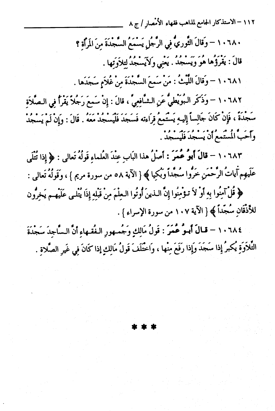 10683 - قَالَ أَبُو عُمَرَ: أَصْلُ هَذَا الْبَابِ عِنْدَ الْعُلَمَاءِ قَوْلُهُ تَعَالَى: "إِذَا تُتْلَى عَلَيْهِمْ آيَاتُ الرَّحْمَنِ خَرُّوا سُجَّدًا وَبُكِيًّا " الْآيَةُ 58 مِنْ سُورَةِ مَرْيَمَ، وَقَوْلُهُ تَعَالَى: "قُلْ آمِنُوا بِهِ أَوْ لَا تُؤْمِنُوا إِنَّ الَّذِينَ أُوتُوا الْعِلْمَ مِنْ قَبْلِهِ إِذَا يُتْلَى عَلَيْهِمْ يَخِرُّونَ لِلْأَذْقَانِ سُجَّدًا " الْآيَةُ 107 مِنْ سُورَةِ الْإِسْرَاءِ.